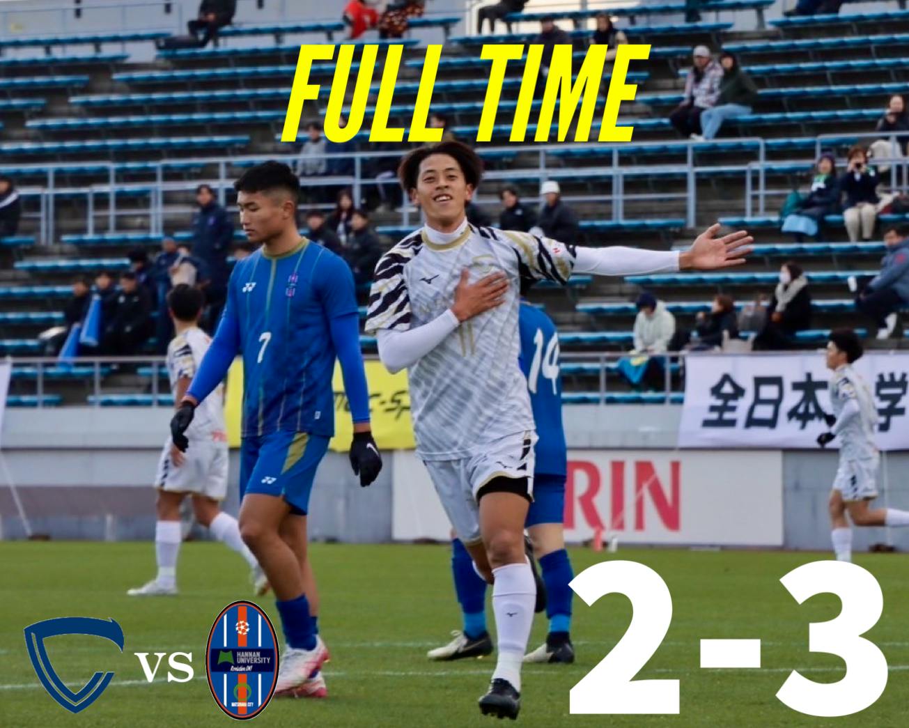 2024/12/19 16:14こんにちは!昨日(12/18)に『MCCスポーツ presents 2024年度 第73回 全日本大学サッカー選手権大会 決勝ラウンド グループステージ第3節』桐蔭横浜大学戦が行われました。グループステージ突破には、勝利が絶対条件となった一戦は互いに一歩も譲らない拮抗した試合展開となった。後半26分、4.桒田大誠(暁星国際高校 4年)のロングフィードを受けた28.光本和馬(中京大学附属中京高校 3年)が左サイドで起点を作る。一度は相手にクリアされるものの、10.武藤寛(市立船橋高校 3年)がセカンドボールを回収する。その後、7.深澤壯太(大阪桐蔭高校 4年)、6.押富大輝(ヴィッセル神戸U-18 4年)と繋ぎ、最後は11.有働夢叶(興國高校 4年)がワントラップから右足を振り抜き、先制点を奪うことに成功する。(1-0)後半36分、4番からのロングフィードに右サイドで反応した12番が11番へパスを繋ぐ。11番が内側に切り返し、左足でGKも出ることの出来ない絶妙な場所へクロスを上げる。10番が上手くマークを外しゴールを決め、試合を振り出しに戻される。(1-1)後半41分、ビルドアップの中で15番にボールを奪われ、12番にスルーパスを送られる。12番がワントラップから右足でゴールに流し込み、逆転を許してしまう。(1-2)その後も猛攻を仕掛けるも、追加点を奪うことが出来ず、1-2で試合終了した。大会方式が一新した今大会は予選ラウンドをPK戦の末、勝利することができ決勝ラウンドに進出した。しかし、グループステージは全ての試合で先制点を奪うが、逆転を許してしまい、3連敗でグループステージ敗退となった。今シーズンの全国大会は総理大臣杯に引き続きベスト16で幕を閉じた。4年生の皆さん、本当にお疲れ様でした。次のステージでの活躍を期待しています!今回、初めての試みとなったクラウドファンディングにご支援いただいた皆さん、誠にありがとうございました。目標を達成することはできませんでしたが、常に中京大学体育会サッカー部へ熱い応援が選手たちの頑張る活力や励みとなっていました。来シーズン、今シーズンよりも良い結果を残せるようにチーム一丸となり頑張ります!今後とも中京大学体育会サッカー部への熱い応援、何卒よろしくお願いいたします。中京大学体育会サッカー部 主務 福井暁阿 もっと見る
