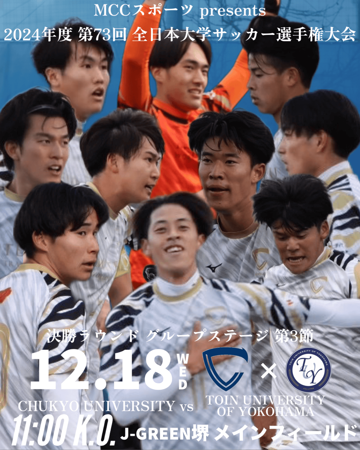 2024/12/18 00:07夜分遅くに失礼します。明日(12/18)『MCCスポーツ presents 2024年度 第73回 全日本大学サッカー選手権大会 決勝ラウンド グループステージ』第3節 桐蔭横浜大学戦がJ-GREEN堺メインフィールドで行われます。第1節 新潟医療福祉大学戦・第2節 阪南大学戦と立ち続けに先制点を奪いながら、リードを守り切ることが出来ず、連敗を喫しました。2連敗でBグループ4位であるが、最終戦に勝利すれば、第2試合目 阪南大学 vs 新潟医療福祉大学の結果次第でグループステージ突破の可能性が残っています。まだ勝ち上がる可能性が残っている以上、選手・スタッフは勝利のために全力で戦います。絶対に負けられない一戦である明日のピックアッププレイヤーを紹介します。1人目の選手は10.武藤寛(市立船橋高校 3年)です。武藤寛選手の特徴はセカンドボールへの反応や一瞬のスピードです。3年生ながらエースナンバー10番を背負い、J2リーグ所属の愛媛FCへの内定も決めています。また、ボランチや右サイドハーフ、時には右サイドバックなど複数ポジションを遜色なくプレーできるユーティリティー性も兼ね揃えていて、チームには欠かせない選手です。◇武藤選手コメント◇「明日は他力にはなりますが、まずは目の前の試合に勝てるように頑張ります。また、個人的にはここまで何も結果を残せていないので、ゴールとアシストで結果を残します。4年生にはピッチの中ではもちろんピッチ外でもたくさんお世話になったので、そんな4年生と少しでも長く試合がしたいです。僕たち下級生は、個人としての結果はもちろん、4年生たちと勝利を分かち合うために全身全霊をかけて戦います。」そして、2人目の選手は18.中嶋晃成(中部大学第一高校 2年)です。中嶋晃成選手の特徴はフィジカルを生かしたポストプレーや推進力、長身を生かした打点の高いヘディングです。今シーズンの前期は怪我の影響もあり、なかなか試合に絡むことが出来ず、2ゴールのみであったが、後期ではスタメンに定着し、リーグ戦11試合で驚異の11ゴールを決め、リーグ戦チーム最多の13ゴールで後期無敗に大きく貢献した選手です。◇中嶋選手コメント◇「グループリーグ突破の僅かな可能性を信じて、必ず勝つために全力で闘います!お世話になった4年生とやれるサッカーを心から楽しんで、一瞬一瞬を噛み締めながらプレーしたいと思います!」中京大学体育会サッカー部 主務 福井暁阿 もっと見る