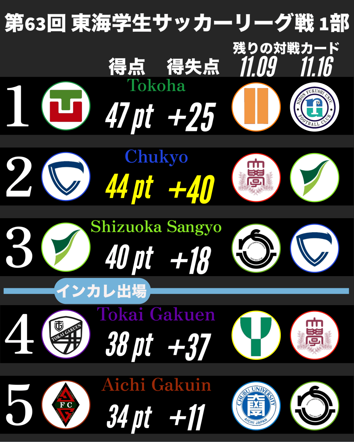 11月9日(土)15:00 KICKOFF vs 中部大学(8位)