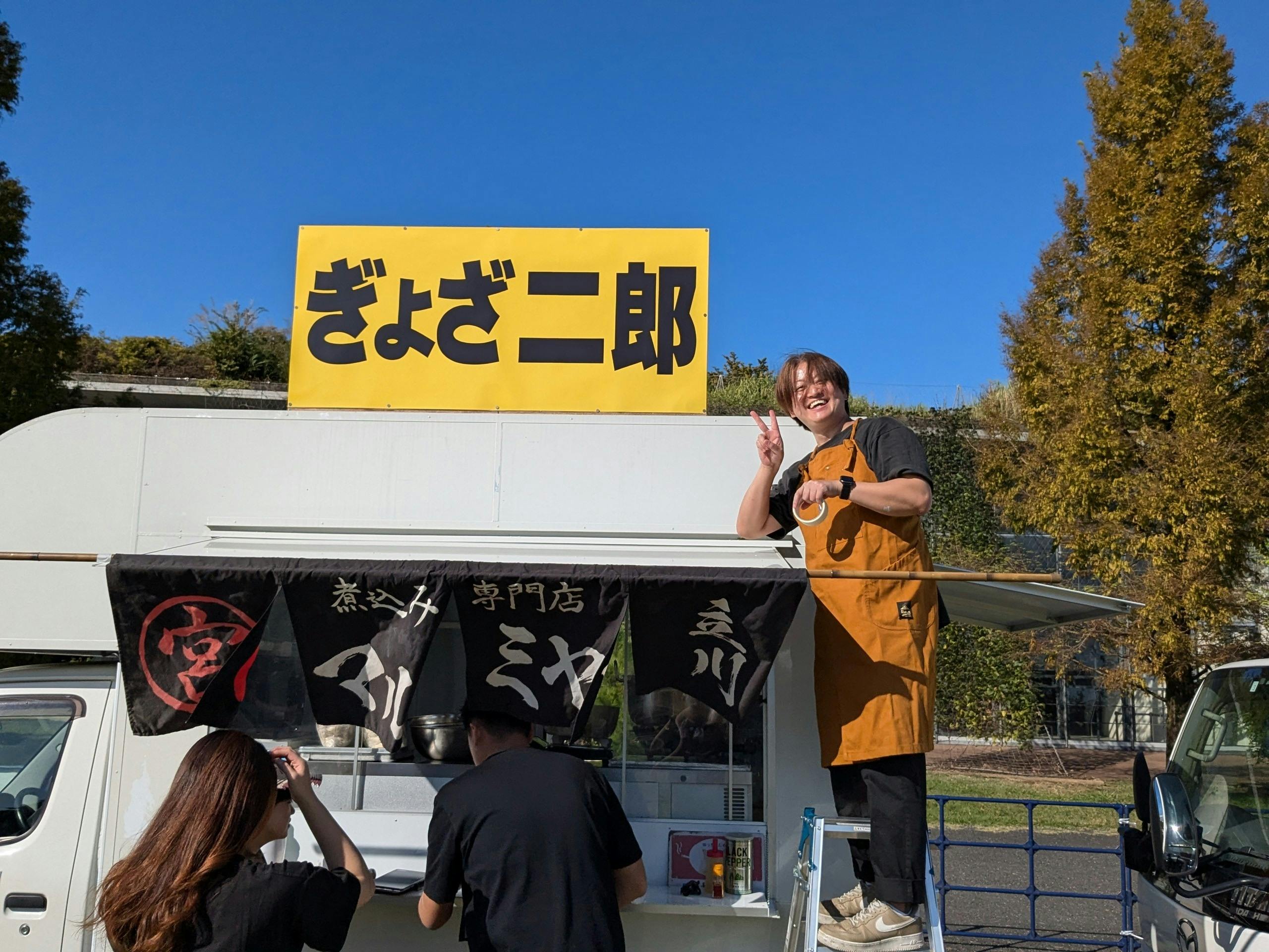 そして最終日に持ってきたのがこの写真の黄色い「ぎょざ二郎」の看板。