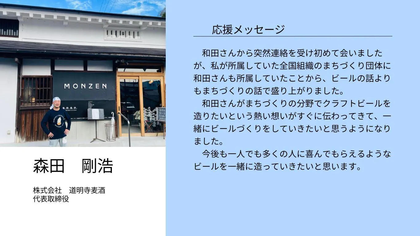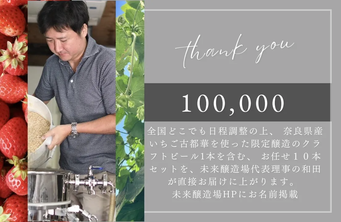 2024/12/11 22:50この度はご支援をいただき、改めてお礼を申し上げます。本当にありがとうございました。クリスマスまでには返礼品が届くように準備を行い、全ての返礼品の発送及び高額支援をいただきました方々には個別のご連絡をさせて頂きました。今回のクラウドファンディングで最終目標である300万円には届きませんでしたが、おかげさまで冷蔵設備関連や醸造関連費を賄うことができました。これにより次なる目標に向かって走り出すことができますことを、心より感謝を申し上げます。今後は、さらに生駒産や奈良産などの果物や農産物を使いながら、ワークショップ形式でビールのレシピを決めたり、醸造体験の場を創出していきます。そして、人生の楽しさを皆さんと共有しながら、Well-beingの増進や地域課題の解決策を増やしていきます。これらの情報は、未来醸造場のHPなどで更新していきます。クラフトビールの販売もHPや生駒市内の飲食店を中心に行って参りますので、引き続きご愛顧のほど、よろしくお願いいたします。https://miraibrewery.com一般社団法人 未来醸造場(非営利徹底型)代表理事 和田真人 もっと見る