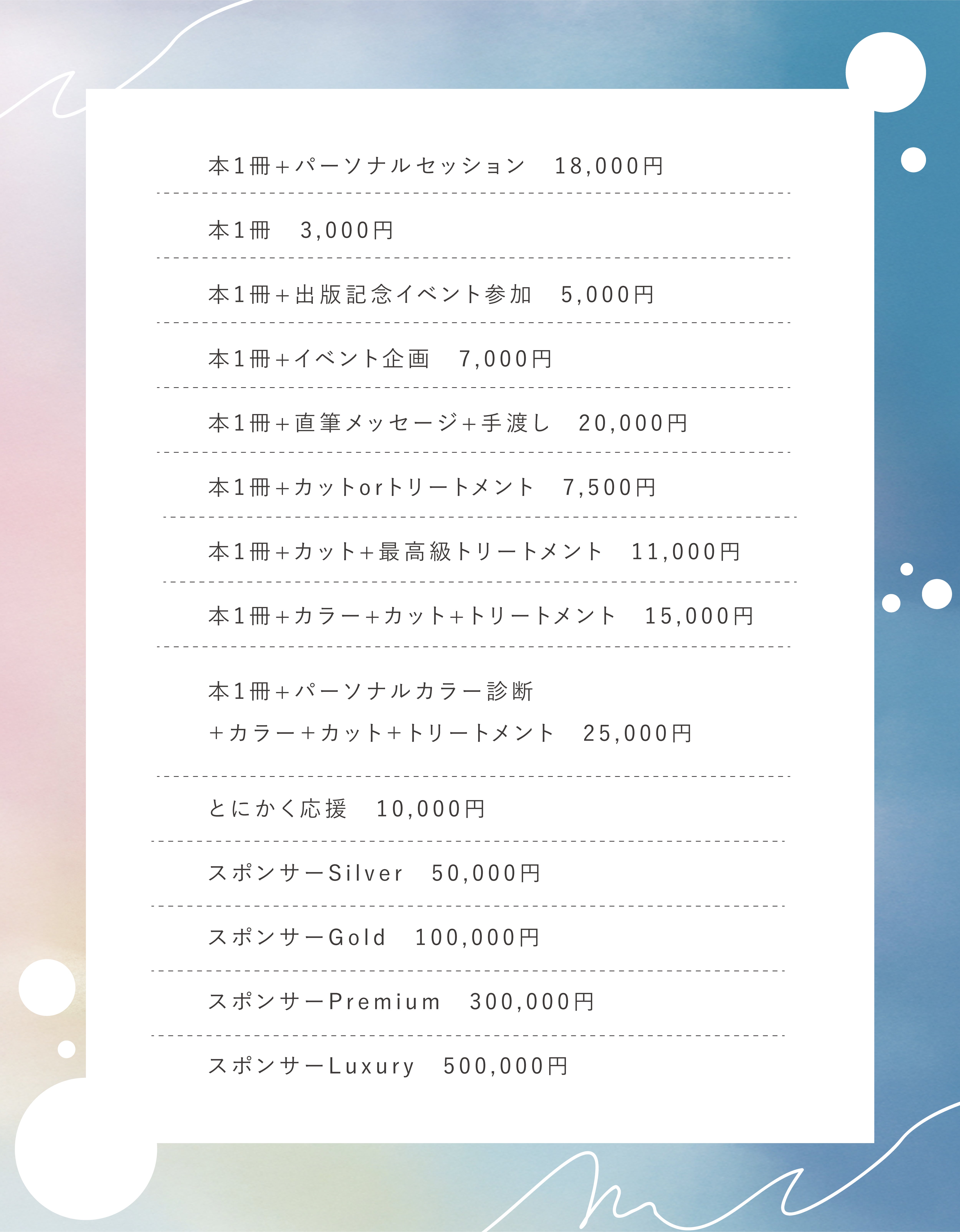 なので、今回のリターンは、今このページを見てくれているあなたが、いつか自分の夢を叶えたくなった時に使う先行投資、またはあなたがワクワクしながら生きていくためのアイテム購入だと思って支援してもらえたら嬉しいです。
