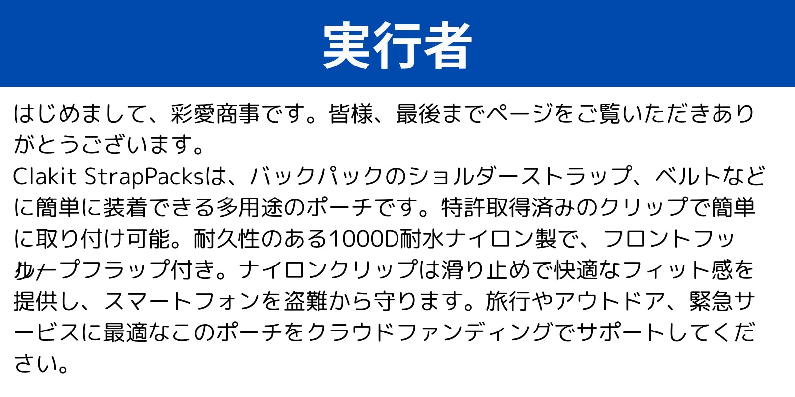 StrapPacksプロジェクトは、スマートフォンを安全で便利に持ち運べる革新的なアクセサリーを提供することを目指しています。現代のライフスタイルに合ったこの製品は、耐久性と使いやすさを兼ね備え、スマートフォンをしっかりと守ります。皆さんの応援とご支援によって、このプロジェクトが成功し、より快適で安心な日常を実現することを願っています。共に新しい未来を創りましょう。