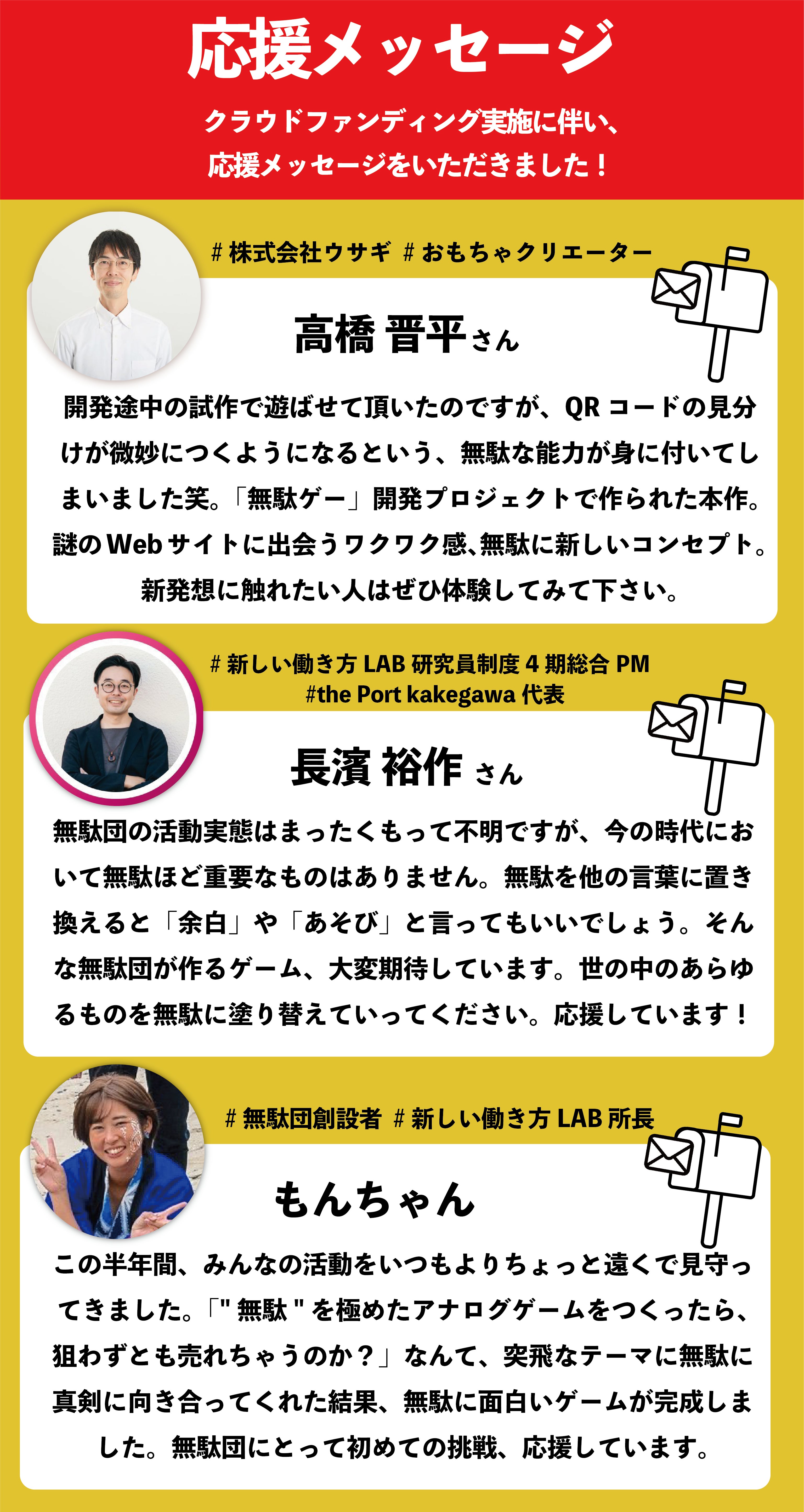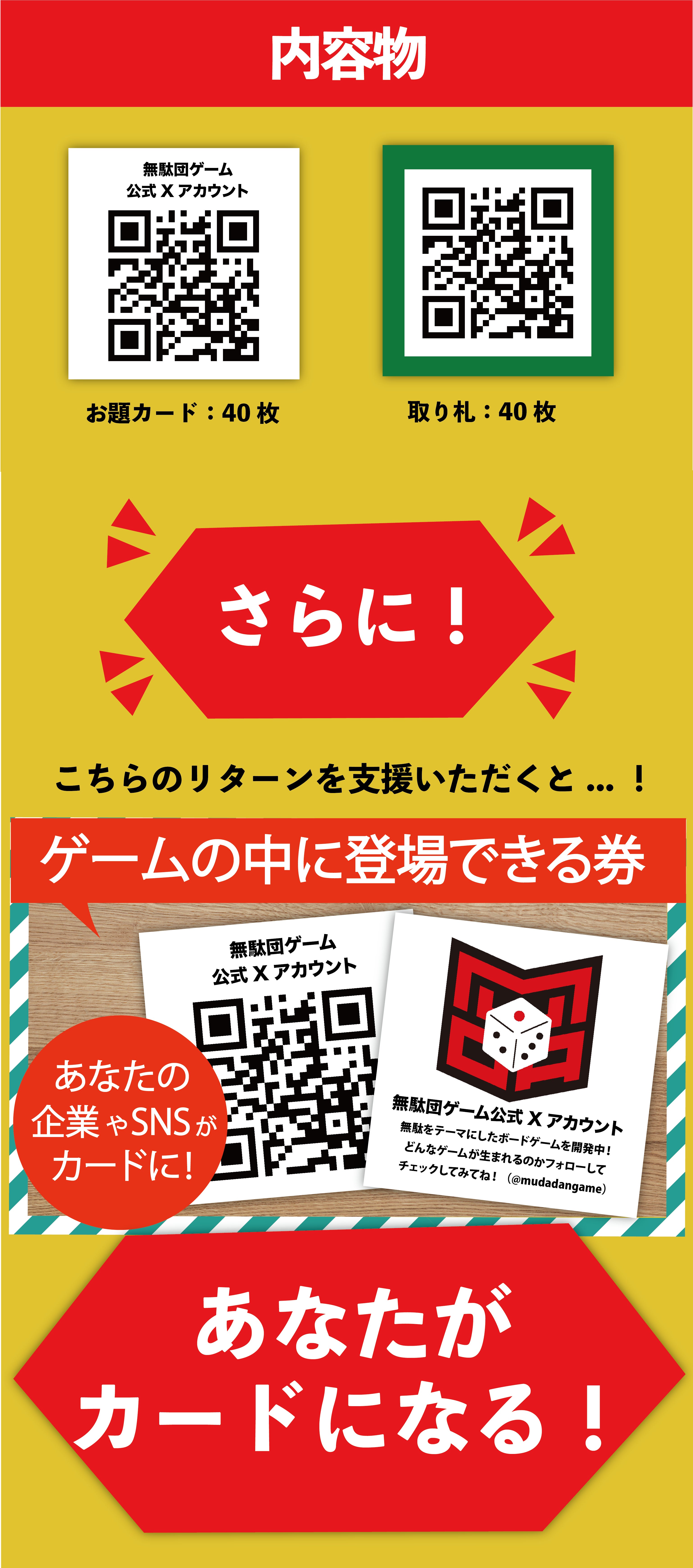 こんにちはMUDA_GAMEです!27名もの方に応援いただき、83,800円もの金額が集まっています。本当にありがとうございます、、!用意していたリターン「超早割」も早々に売り切れ、本当に感謝しかありません。。早いものでプロジェクト終了まで24時間と少しとなりました。皆様から日々形にとらわれない応援をいただき、クラウドファンディング未経験者がほとんどななか日々発信をしておりますが、まだ達成まで116,200円必要な状況となっております。残り1日と少ししかありませんが、引き続き、出来うる限りのことを行いつつ、22:30からはXのスペースも行いますので、そんな機会も活かしつつ達成まで走りきれればと思っています。ゲームは200個生産予定ですが、先着30名でなんとゲームに登場できる権利がリターンとして存在します。5,000円でゲームに登場して自分の活動が宣伝でき、ゲームが1つ付いてくるおすすめのプランになっていますので、ぜひお知り合いで自分のサービスや活動を広めたい!という方がいらっしゃれば、ぜひこのプロジェクトのリンクをシェアいただけたら幸いです、!めちゃくちゃ無駄で、そして面白いゲームができました。引き続き何卒応援よろしくお願いいたします、!!