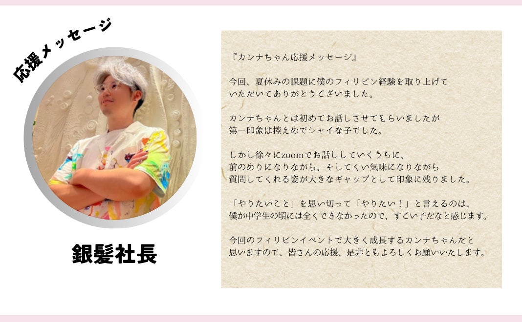 今回のフィリピン旅行企画者で私がフィリピンに興味をもったきっかけとなる銀髪社長から応援のメッセージをいただきました!