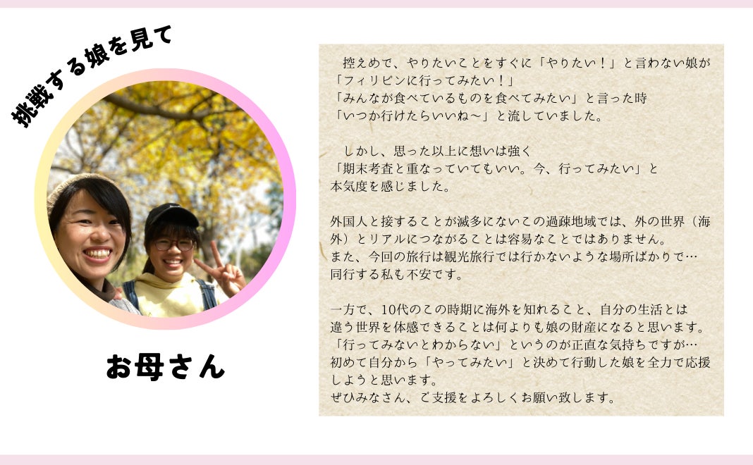 当初、母にフィリピンへ行きたい!と話したら…「旅費はどこから出すの?」と聞かれ、答えに困りました。
