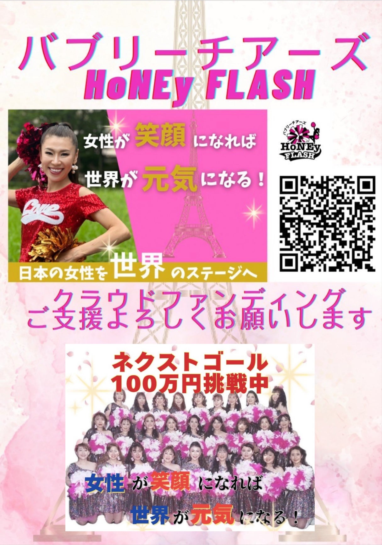 9/23からスタートした初めてのチャレンジのクラウドファンディングは、たくさんの皆さまのご支援のおかげでネクストゴール100万円を達成する事ができました!本当に本当にありがとうございました。私自身クラウドファンディングをやると決めた時から、必ず目標達成する!やりきる!事を決めていました。新しい事にチャレンジする時は、未知の世界へ足を踏み入れるドキドキする気持ちと、どんな事が起きるんだろう?という想像をしていない未来へワクワクする気持ちで溢れます。でも走り切った今言える事は『やってよかった!』という気持ちでいっぱいです。たくさんの方々からのあたたかい応援メッセージに励まされ、支援をしてくださったお知らせメールが届くたびに感謝の気持ちでいっぱいになり、本当に本当に嬉しかったです!ありがとうございました。大きなチャレンジだったパリコレ出演も大盛況に終わり、今年も残すところあと2つのイベント出演となりました。チームのモットーの『女性が笑顔になれば世界が元気になる!』パリコレで私たちのダンスを見て世界の方々からたくさん賞賛の声をいただいた事で、私たちの活動に更に自信を持つ事ができました。来年は更にたくさんの皆さんに笑顔を届けられるように活動を広げていきます。これからも皆さんに笑顔と全力で応援を届けていきます!バブリーチアーズHoNEy FLASHの活動を今後もあたたかく見守っていただけましたら幸いです。引き続きどうぞよろしくお願いいたします!バブリーチアーズHoNEy FLASH代表 小野香代子