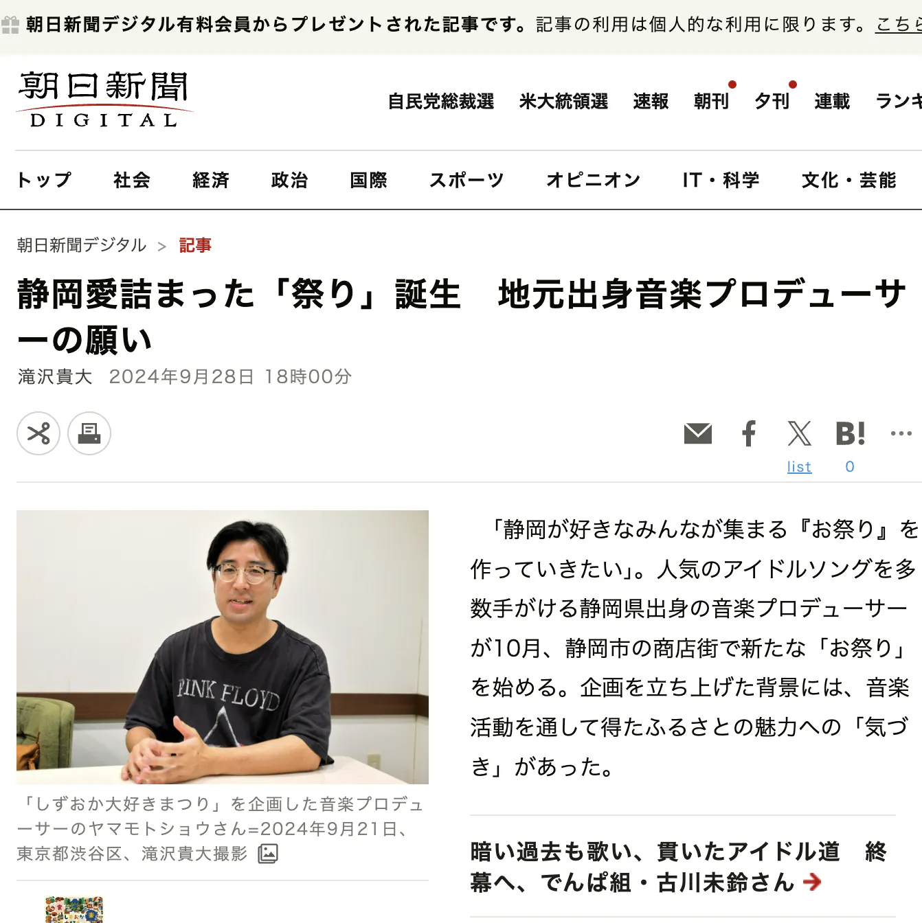 記事リンク:静岡愛詰まった「祭り」誕生 地元出身音楽プロデューサーの願い