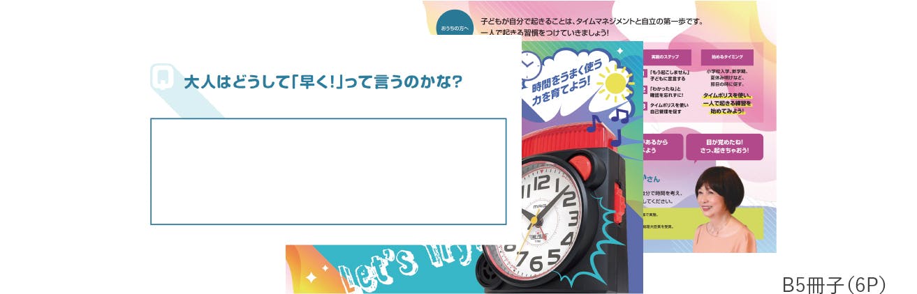世の中にはたくさんの目覚まし時計がありますが、それでも朝起きないという悩みは尽きません。目覚まし時計だけでは解決できない、もっと深い問題があるのではないかと考えました。そこで、私たちは問題解決に適した商品(タイムポリス)と親子で向き合う時間の使い方冊子を作りました。このワーク冊子は親と子が共に時間の使い方を見直し、自立への一歩を踏み出すお手伝いをします。