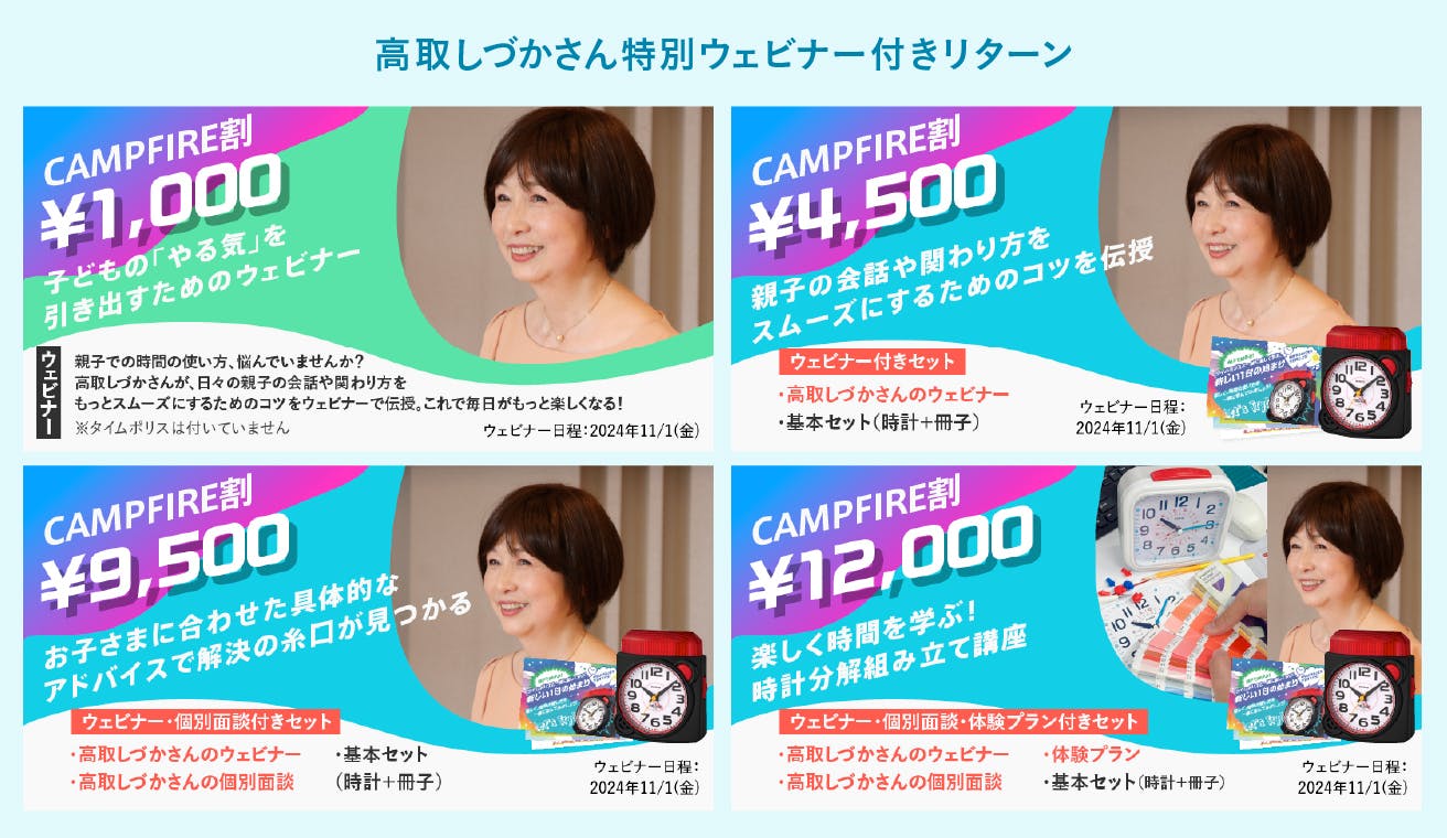 11月1日15:00以降に高取しづかさんのウェビナーに関するリターンをご支援いただいた場合は、ウェビナーのアーカイブ動画をお送りいたします!