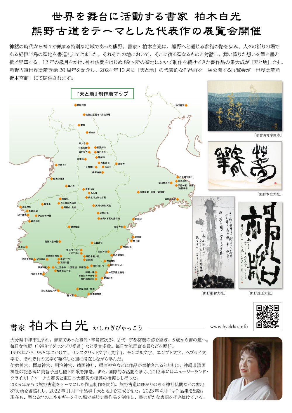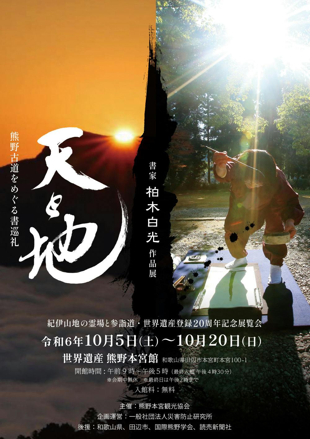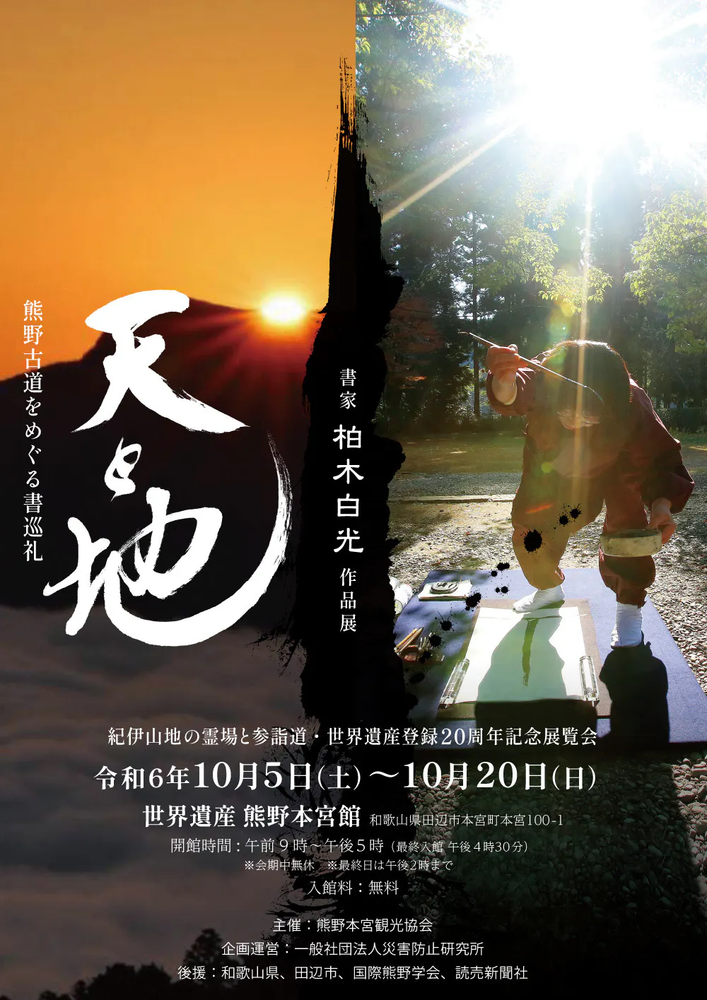 2024年10⽉5⽇から10⽉20⽇、世界遺産登録20周年記念展覧会として「書家 柏⽊⽩光作品展 『天と地』 熊野古道をめぐる書巡礼」(主催:熊野本宮観光協会)が開催されます。会場は、熊野三⼭のひとつ、熊野本宮⼤社のふもとにある「世界遺産 熊野本宮館」(和歌⼭県⽥辺市本宮町)です。
