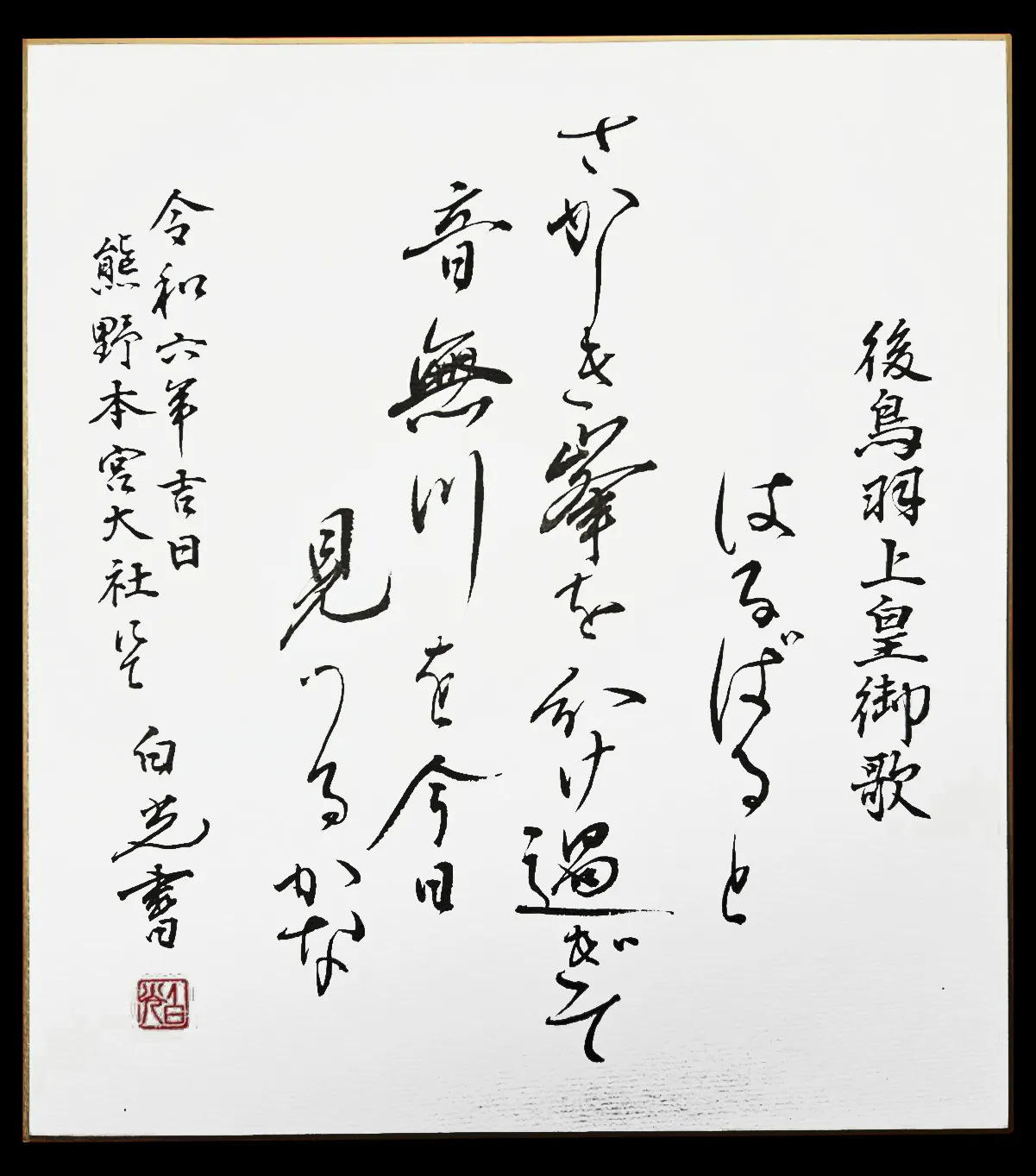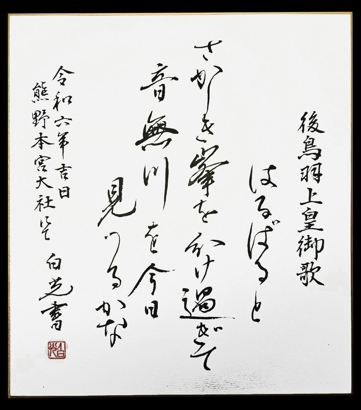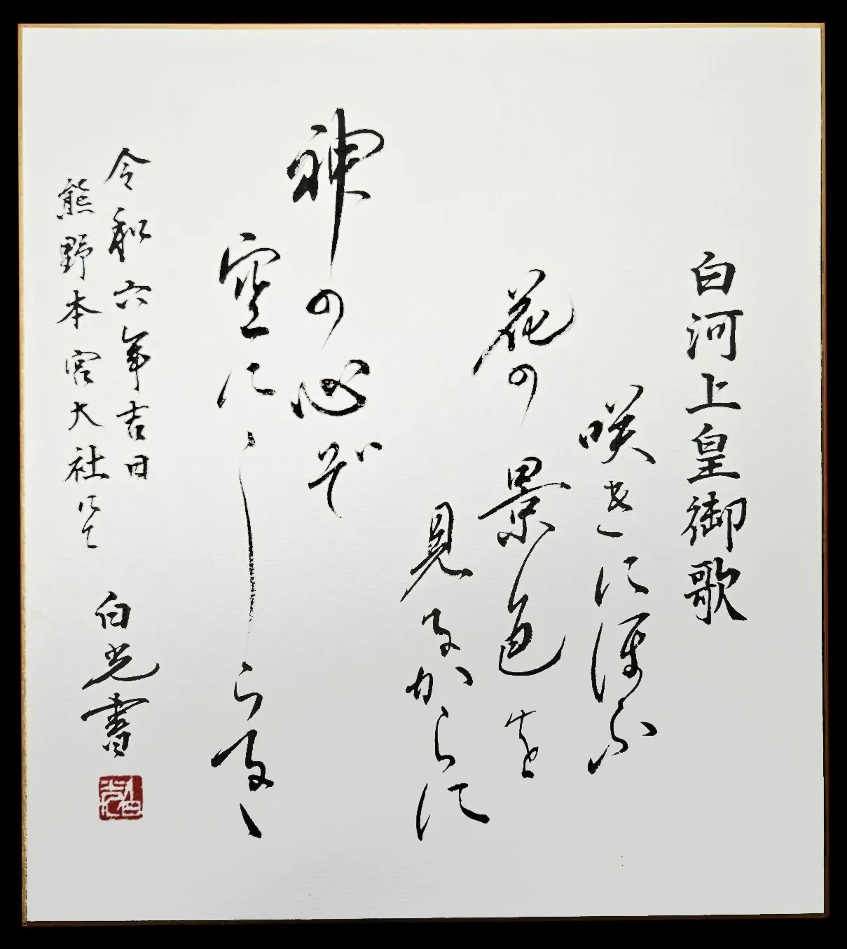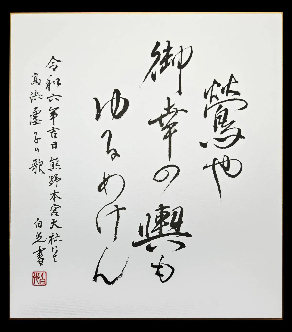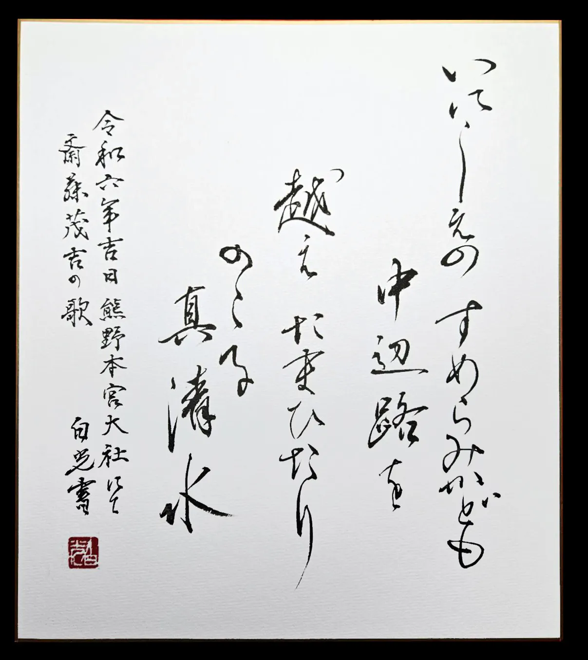 熊野古道にまつわる歌を選び、熊野本宮大社にて柏木白光が揮毫(きごう)した直筆の書の色紙です。9度にわたり熊野御幸を行った白河上皇が熊野本宮大社で詠まれた歌です。熊野本宮大社の歌碑に記されています。