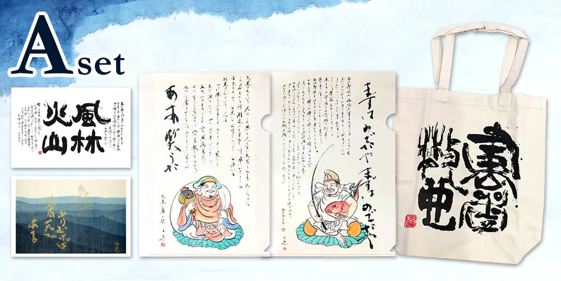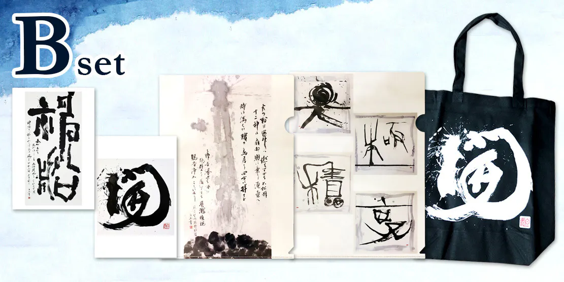 柏木白光が熊野の地で直筆で揮毫(きごう)した「2025年干支のミニ色紙」、「トートバック×1」、「クリアファイル×2」、「ポストカード×2」をセットした白光ざんまい「Asetコース」と「Bsetコース」です。ミニ色紙の書体、配置は白光におまかせください。