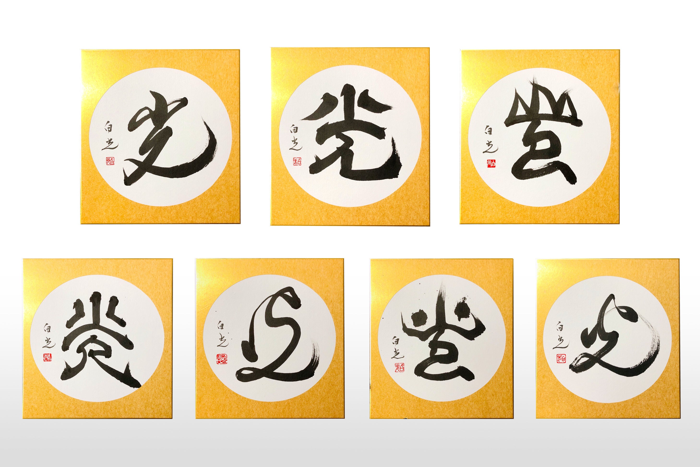 柏木白光が熊野の地で色紙に直筆で揮毫(きごう)した「光」。書体が異なる「光」は7種類あります。柏木白光があなたの為に色紙をお選びいたします。どの書体の色紙がお手元に届くかはわかりませんので到着まで楽しみにお待ちください。