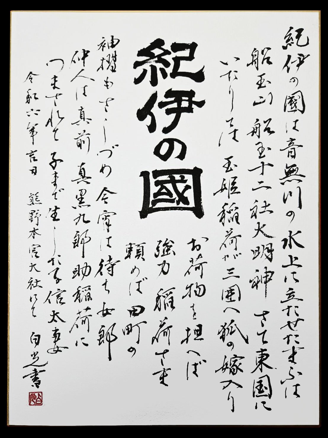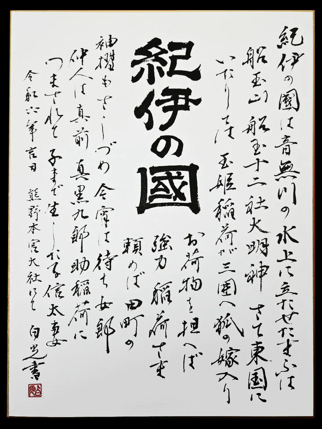熊野古道にまつわる歌を選び、熊野本宮大社にて柏木白光が揮毫(きごう)した直筆の書です。幕末から明治の頃に全国的に流行した「紀伊の国」という端唄です。