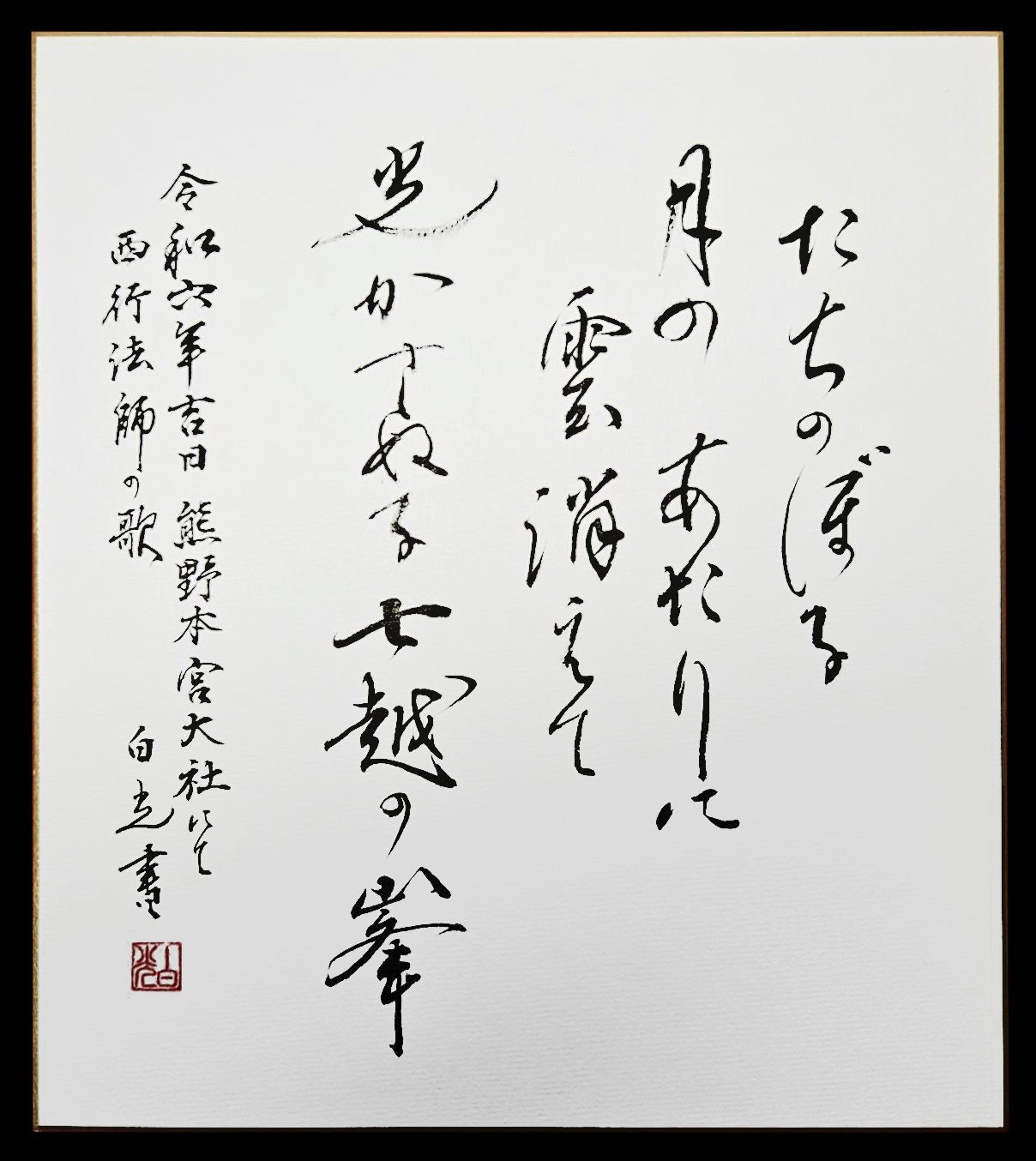 熊野古道にまつわる歌を選び、熊野本宮大社にて柏木白光が揮毫(きごう)した直筆の書の色紙です。平安時代末期から鎌倉時代初期にかけての歌人、西行法師が熊野本宮で詠んだ歌です。七越峰の歌碑に記されています。