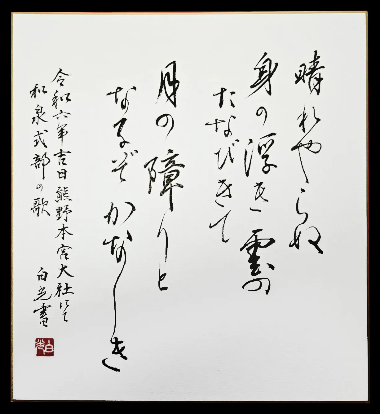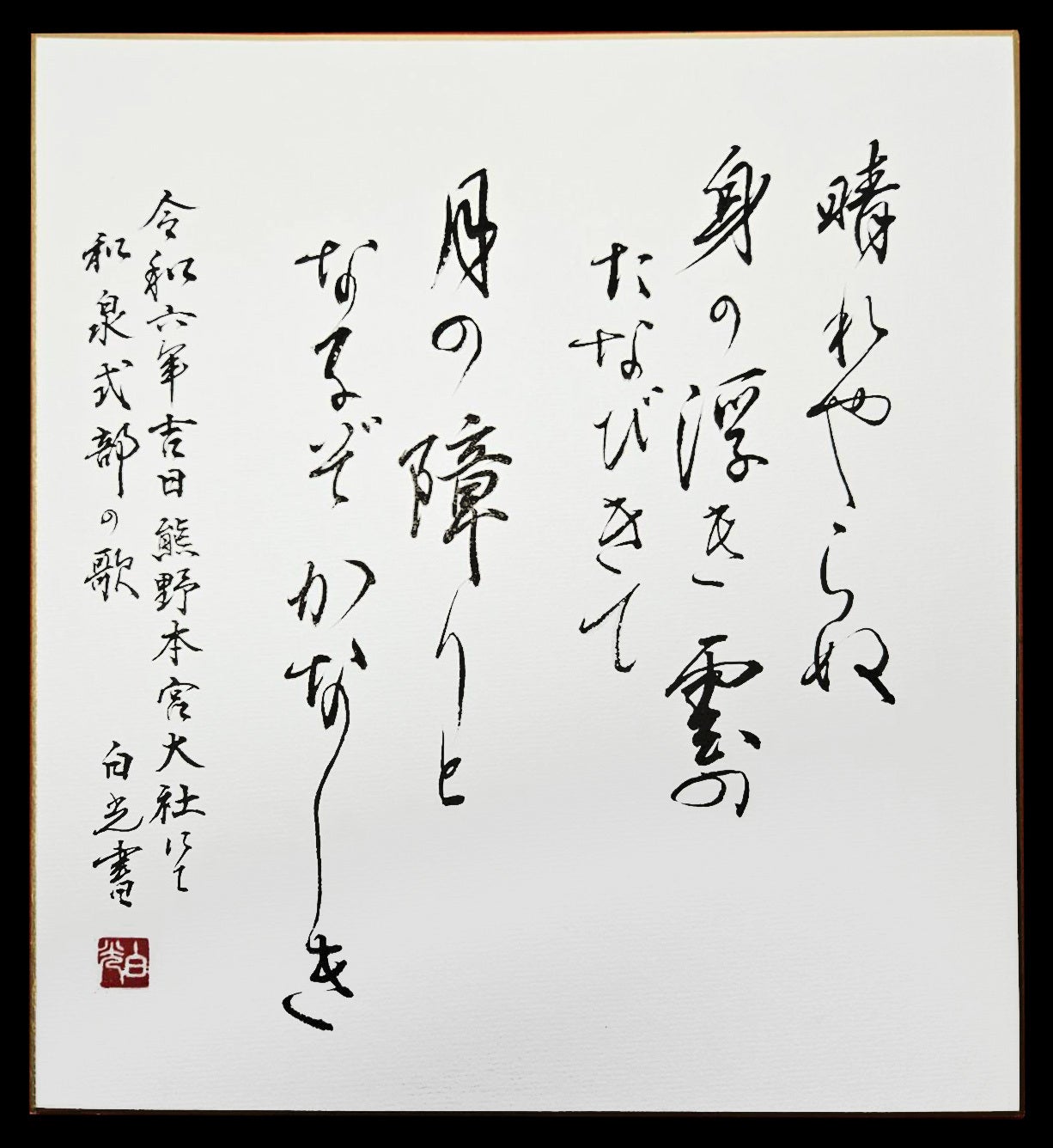 熊野古道にまつわる歌を選び、熊野本宮大社にて柏木白光が揮毫(きごう)した直筆の書の色紙です。平安時代の歌人・和泉式部が、はるかに熊野本宮大社を望む熊野古道伏拝にさしかかったとき、月の障りとなり参拝できぬ悲しさを詠まれた歌です。熊野本宮大社の歌碑に記されています。