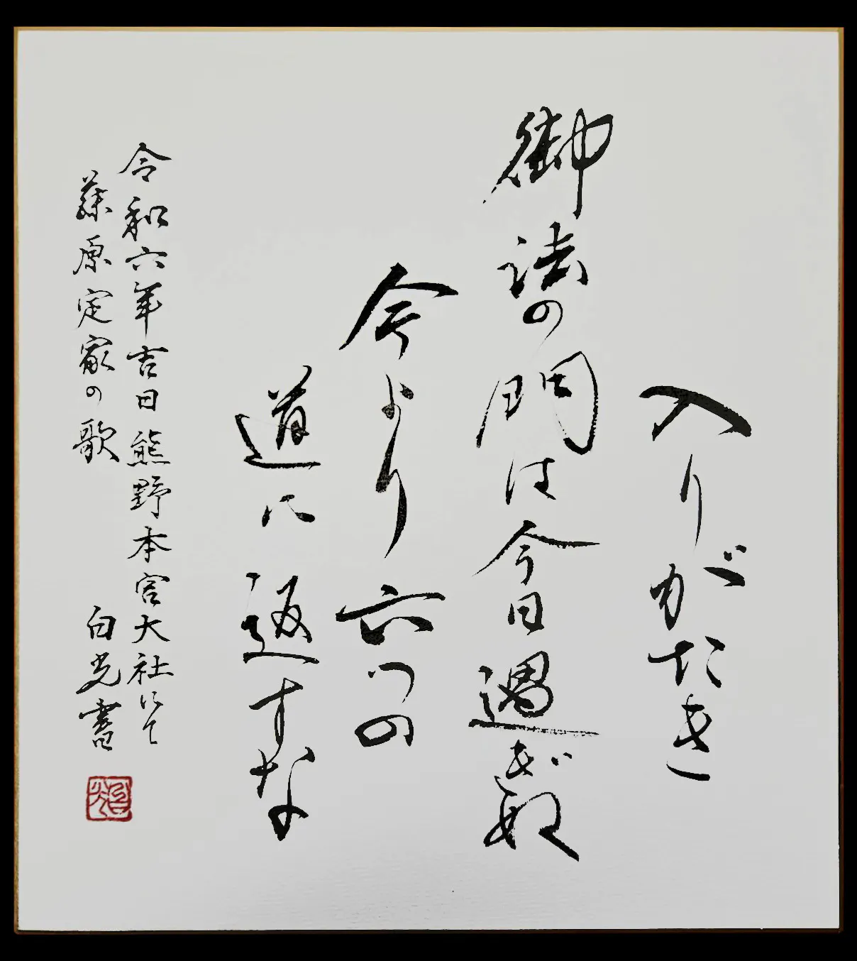 熊野古道にまつわる歌を選び、熊野本宮大社にて柏木白光が揮毫(きごう)した直筆の書の色紙です。平安時代末期から鎌倉時代初期にかけての歌人・藤原定家が熊野古道発心門王子裏手の南無房巽の角の門柱に書き付けた歌です。発心門王子の歌碑に記されています。