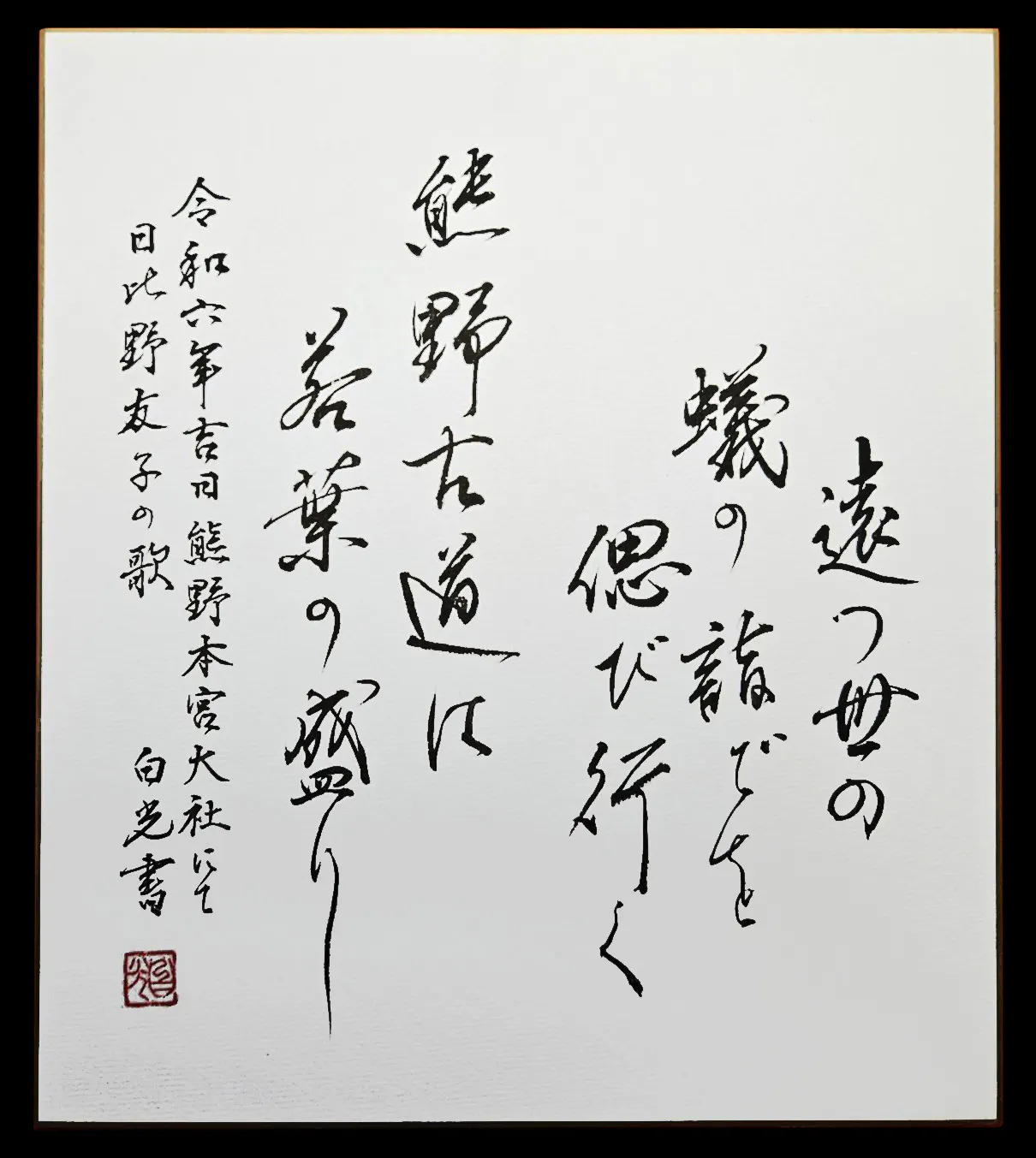 熊野古道にまつわる歌を選び、熊野本宮大社にて柏木白光が揮毫(きごう)した直筆の書の色紙です。近代に活躍した歌人・日比野友子の歌です。熊野古道中辺路街道に建つ碑に記されています。