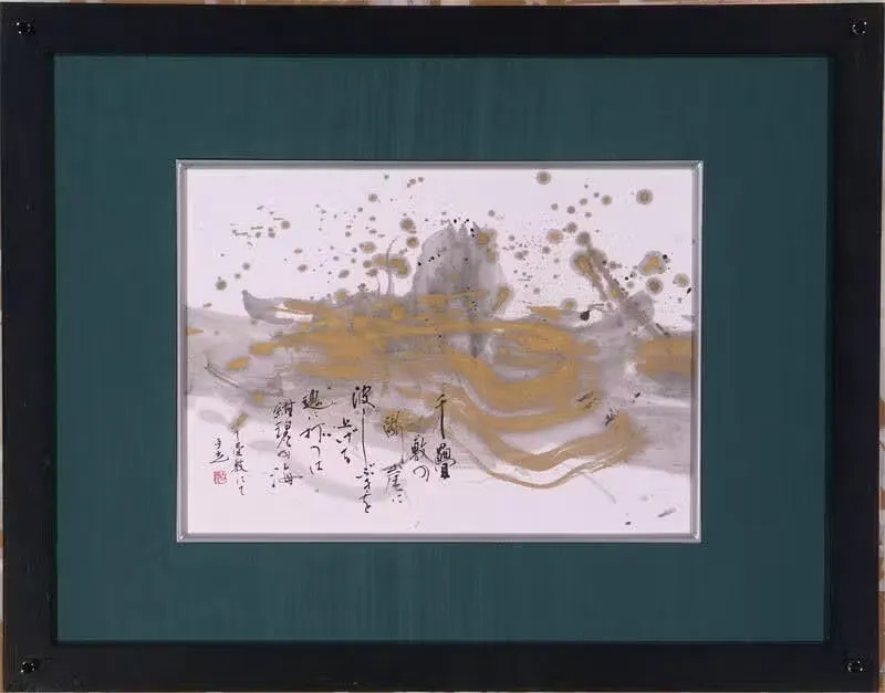 激しい波が太古の地球が育んだ地層を露わにする「千畳敷」。作品を制作した日は台風の直後。激しい波が岩に打ちつけ、水飛沫を上げる一方で、晴天に向かって雲が走り続けます。作品では、千畳敷は淡い墨で、激しい波は金で描かれ、繊細な文字で詩文「千畳敷の断崖に 波しぶきを上げる 魂に打つは 紺碧の海」が書かれています。
