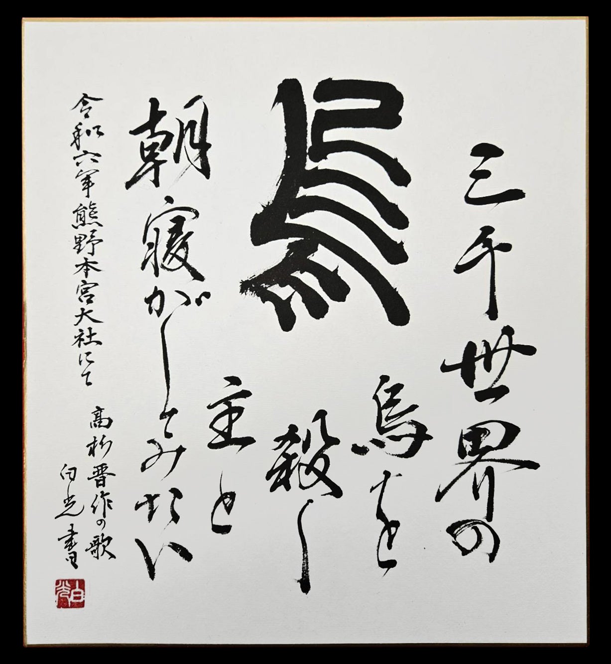 熊野古道にまつわる歌を選び、熊野本宮大社にて柏木白光が揮毫(きごう)した直筆の書の色紙です。幕末の志士・高杉晋作が詠んだと言われる都々逸(どどいつ)です。中央の文字は篆書体の「烏(からす)」ですが、八咫烏にちなみ3本の足が描かれています。