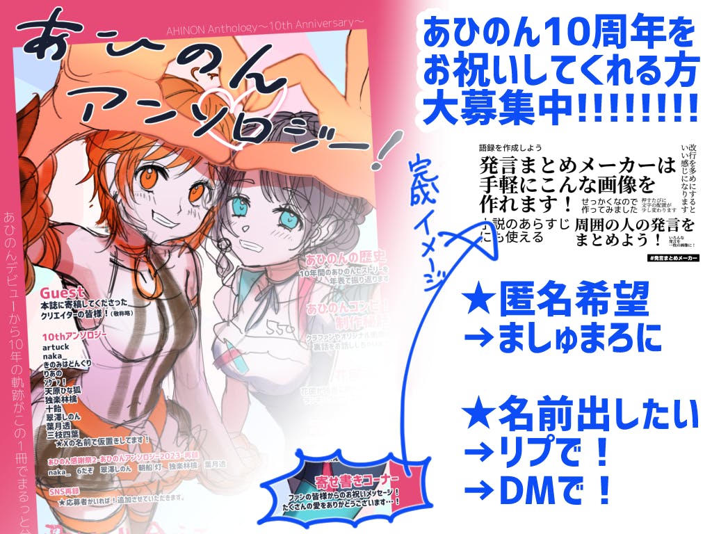 ということで、「あひのん10周年めで鯛」「10周年おめでとうございます~BIGLOVE」「(長文ポエム)」のようなメッセージを募集中です!