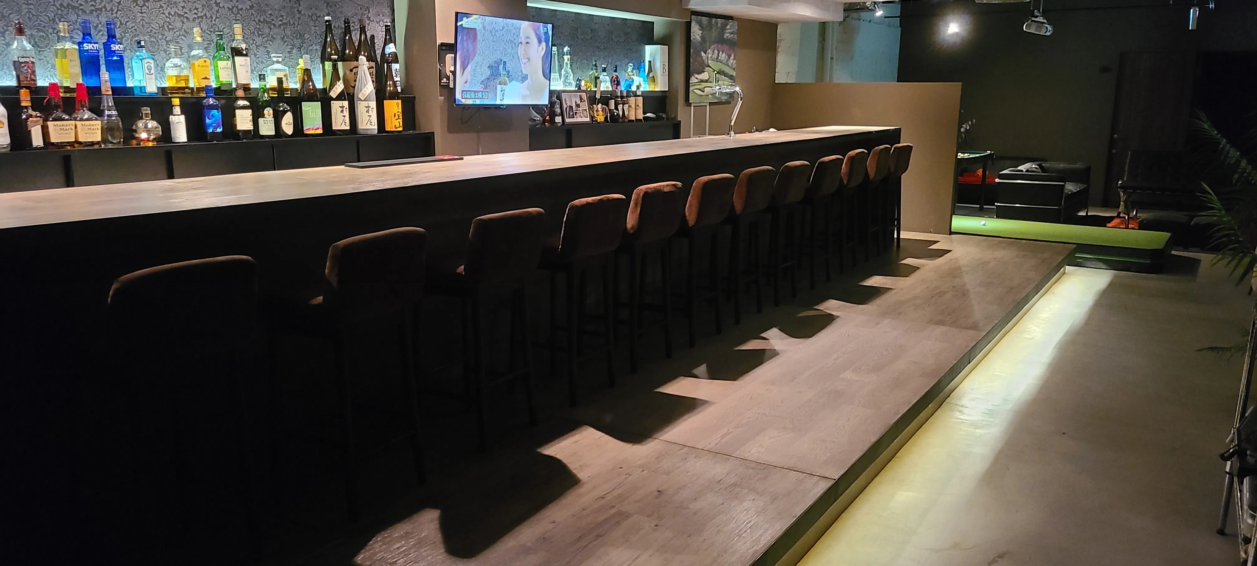 広さ70坪以上を誇る「赤坂台クラブ」の店内には、プライベート空間を提供する個室のゴルフルームが2室完備されております。オープンラウンジは最大15名様までご利用可能で、パッティングゲーム「バーディーワークス」をお楽しみいただけるほか、14名様が座れるモダンなバーカウンターや、6名様用の個室カラオケルームなど、洗練された空間が広がっています。