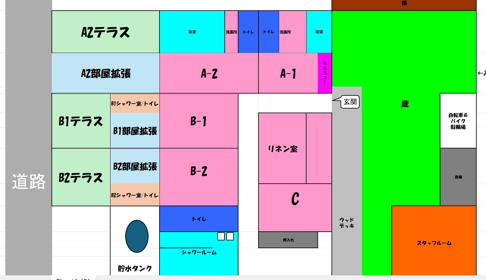 A2はすでにバス、トイレが付いてるので道路側の空きスペースに部屋拡張(約2700㎜×1800㎜)、既存のバスルーム外側の空きスペースをテラス(幅2700㎜ぐらい)を増設、拡張した場所からスライドドアで出入りできるようにします。