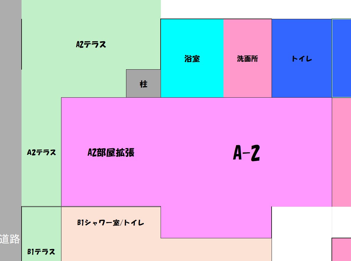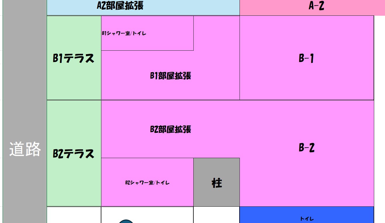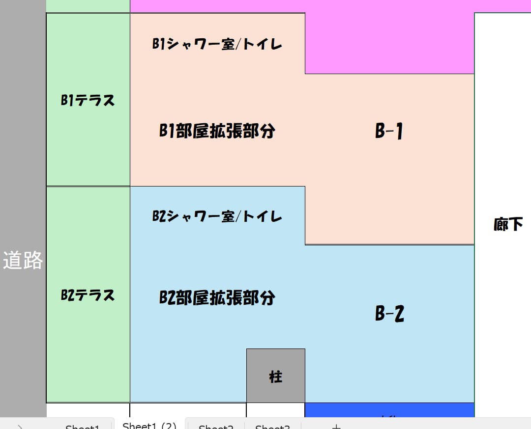 柱を避けて「コ」の字を下に向けたような(B2の部屋のピンク色の空間)何ともブサイク且つ収納性に欠ける間取りとなってします・・・