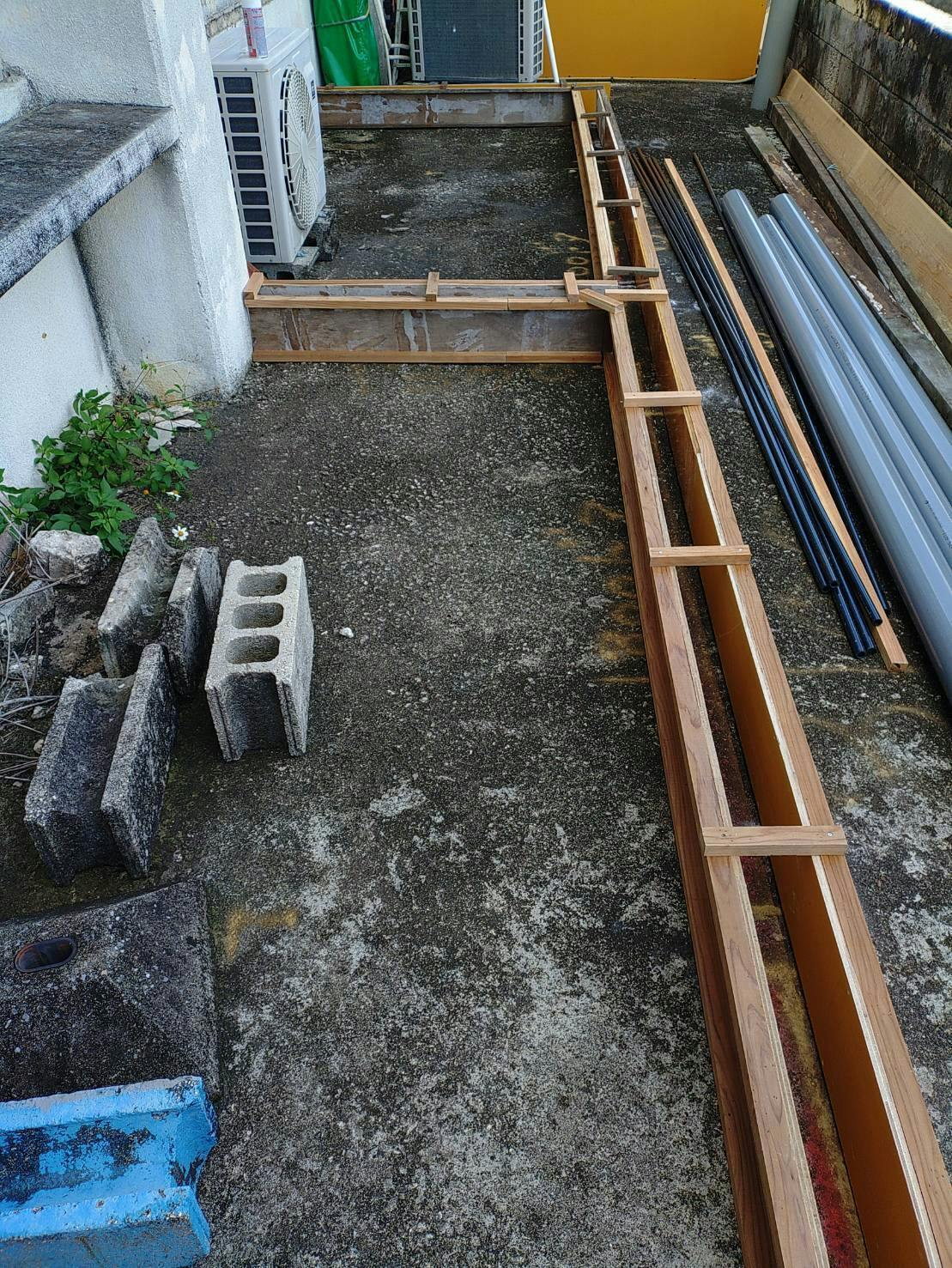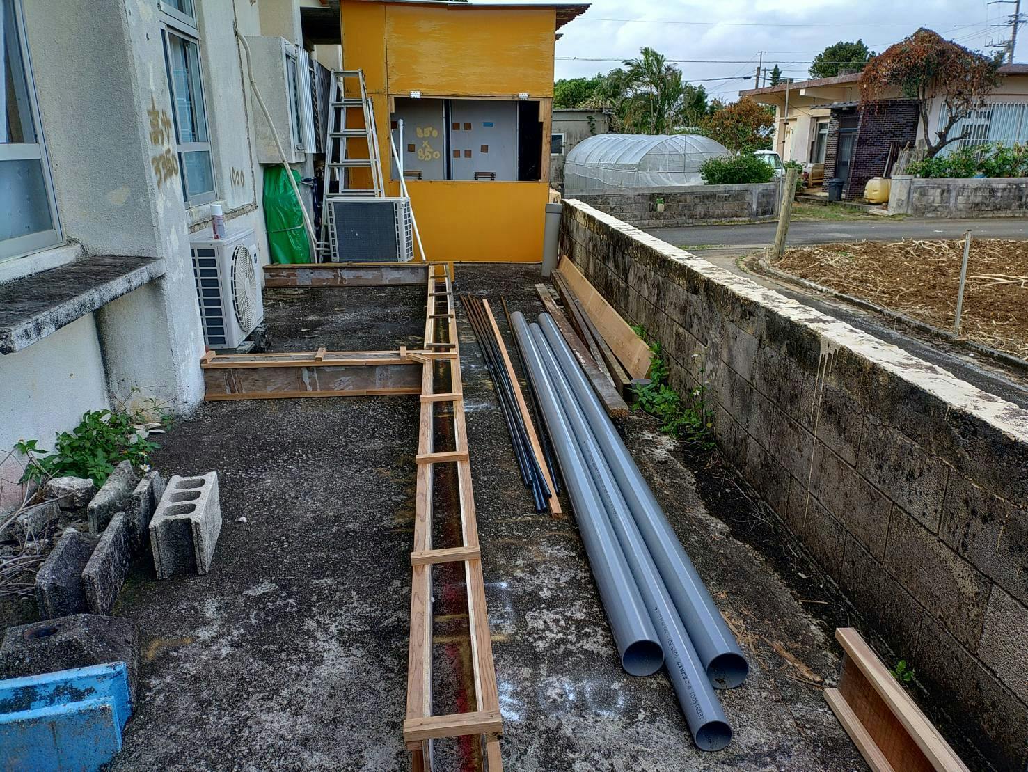 横には買い集めた配管など資材がいっぱい。他にもセメントや配管のジョイント部品など諸々・・・