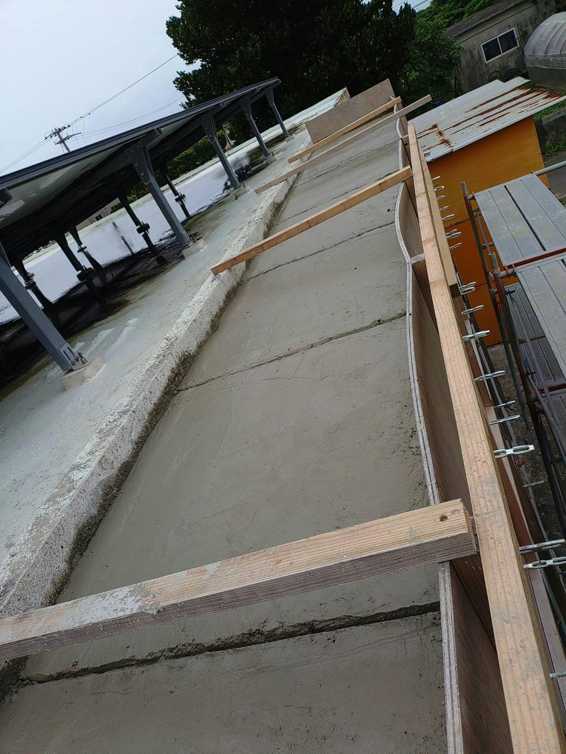 セメント屋さん呼ぶ前にまずは仮枠をレンタルして壁の前に組む。