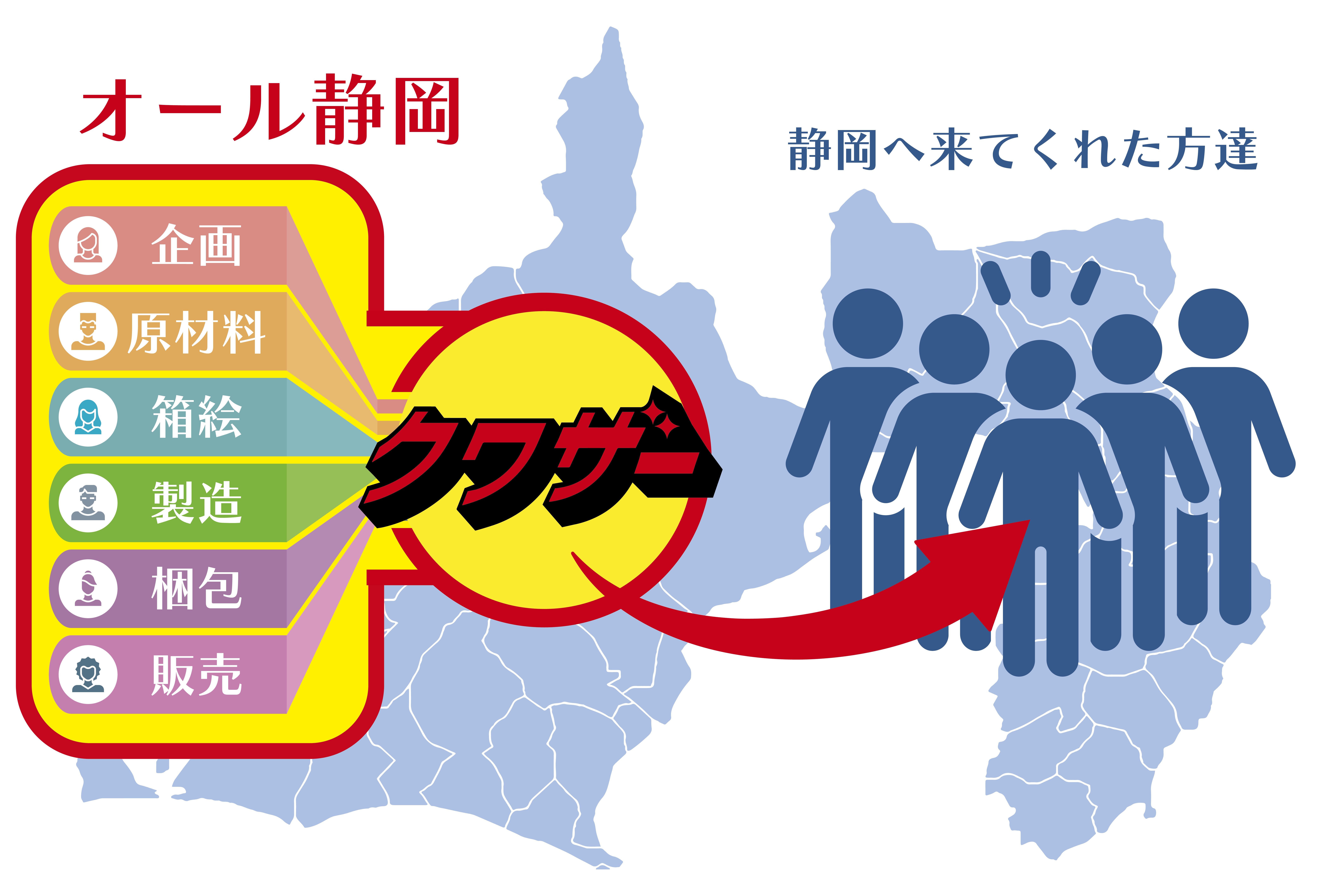 さらに、本当に静岡のお土産にしたっかたので、箱絵、パッケージ製造、中身の生産、可能な原材料を、静岡県内の方、企業様にお願いをし、「オール静岡」を目指しました。思いついたものの、当時に割ける制作予算はありませんでした。そこから約3年かけて、企画や想いをご理解頂き、共に制作を請け負って頂ける静岡の方の繋がりを増やし、少しずつ準備をしてきました。色んな業種と取引のある広告屋の強みを活かし、既存に捉われず、あらゆる商材を生み出す事が出来ます。こうして、静岡のこだわりあるものを、思い思いのボックスアートで包み、箱を開けるワクワク感を盛り込み、静岡のお土産売り場を模型屋さんのように賑やかにする商品企画「静岡クワザー」を考えました。