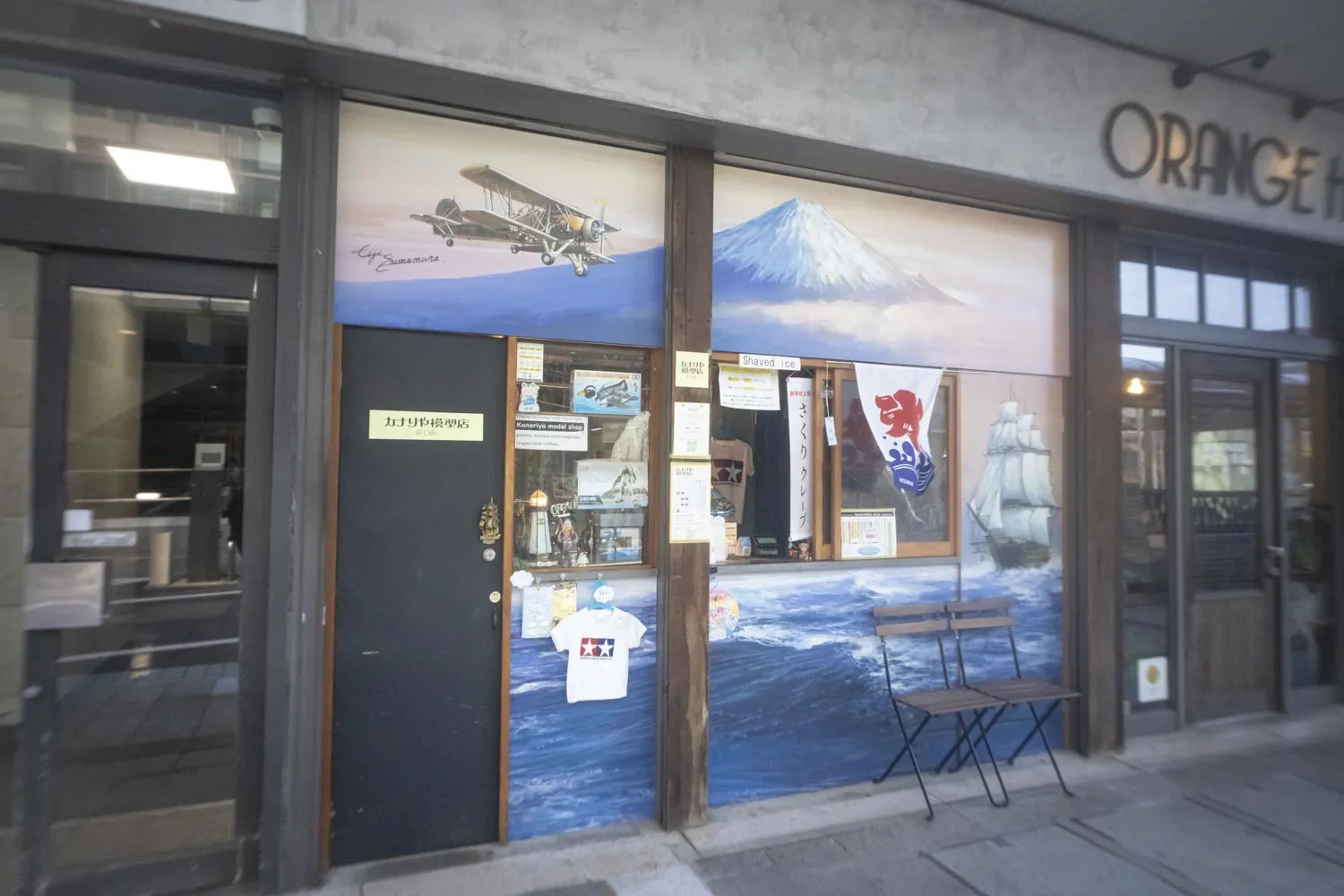 今日は、静岡駅前、紺屋町通りにある「カナリヤ模型店」さんにお邪魔しました。まだ行った事がない方に簡単にご説明させて頂きますと、こちらのお店は、模型が買える喫茶店なのです。この時期は、ふわふわかき氷があり、サクサクなサクリクレープ、コーヒーが絶品のお店です。そしてセレクトされたプラモデルを購入することができます。普段中々お目に掛かれない珍しいプラモデル(非売品)が店内中にディスプレイさせていて別世界のような最高な空間になっています。さらに、店舗の外観は、ボックスアートになっているのです。今回「駿河湾オオグソクムシカレー」のボックスアートを描いて頂いた島村英二先生による作品です。臨場感ある波のしぶき、富士山と淡い空が圧巻です。模型都市静岡の玄関口にふさわしい、とっても素敵なお店です!