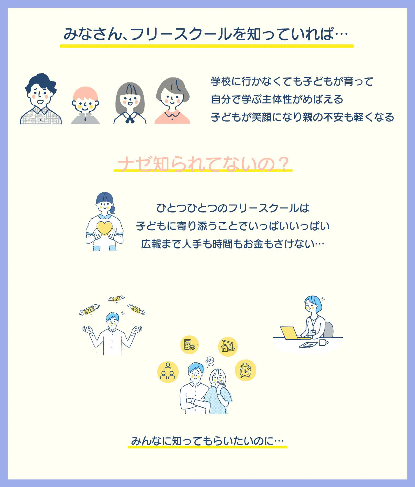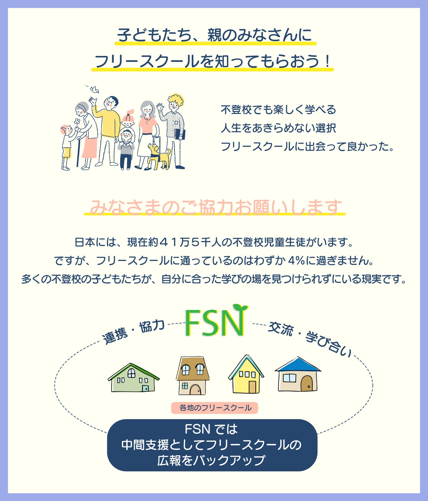 みなさまのご理解・ご協力が、より多くの不登校の子どもたちとフリースクールをつなげる力となります。是非、ご協力のほど、よろしくお願いします。