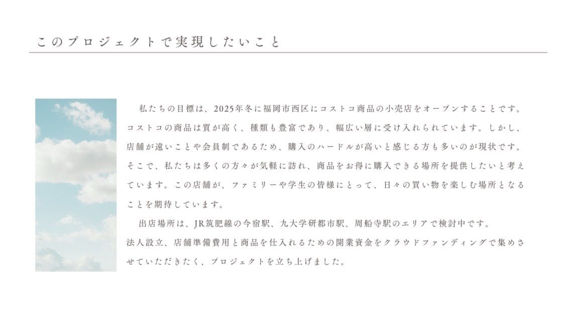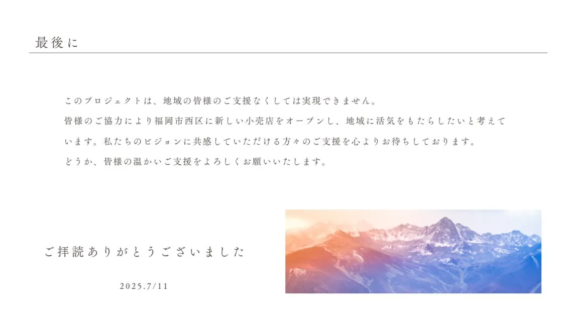 このプロジェクトは、地域の皆様のご支援なくしては実現できません。皆様のご協力により、福岡市西区に新しい小売店をオープンし、地域に活気をもたらしたいと考えています。私たちのビジョンに共感していただける方々のご支援を心よりお待ちしております。どうか、皆様の温かいご支援をよろしくお願いいたします。