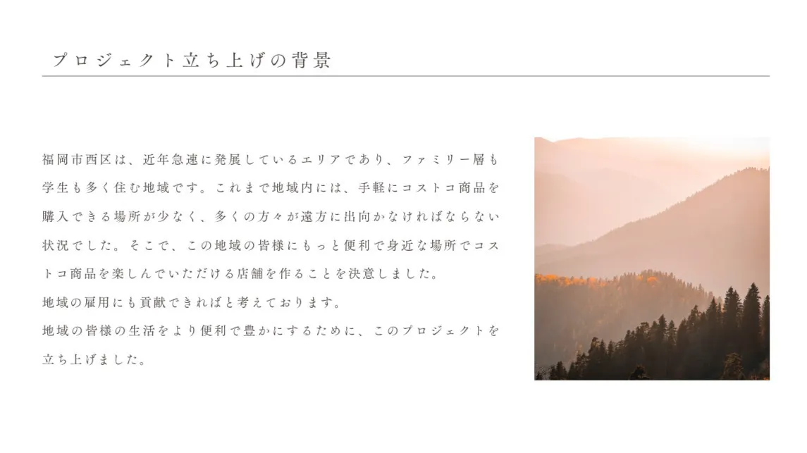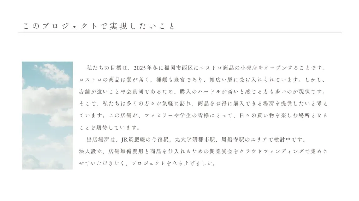 私たちの目標は、2025年冬に福岡市西区にコストコ商品の小売店をオープンすることです。コストコの商品は質が高く、種類も豊富であり、幅広い層に受け入れられています。しかし、店舗が遠いことや会員制であるため、購入のハードルが高いと感じる方も多いのが現状です。そこで、私たちは多くの方々が気軽に訪れ、日常生活で必要な商品を気軽にお得に購入できる場所を提供したいと考えています。この店舗が、ファミリーや学生の皆様にとって、日々の買い物を楽しむ場所となることを期待しています。