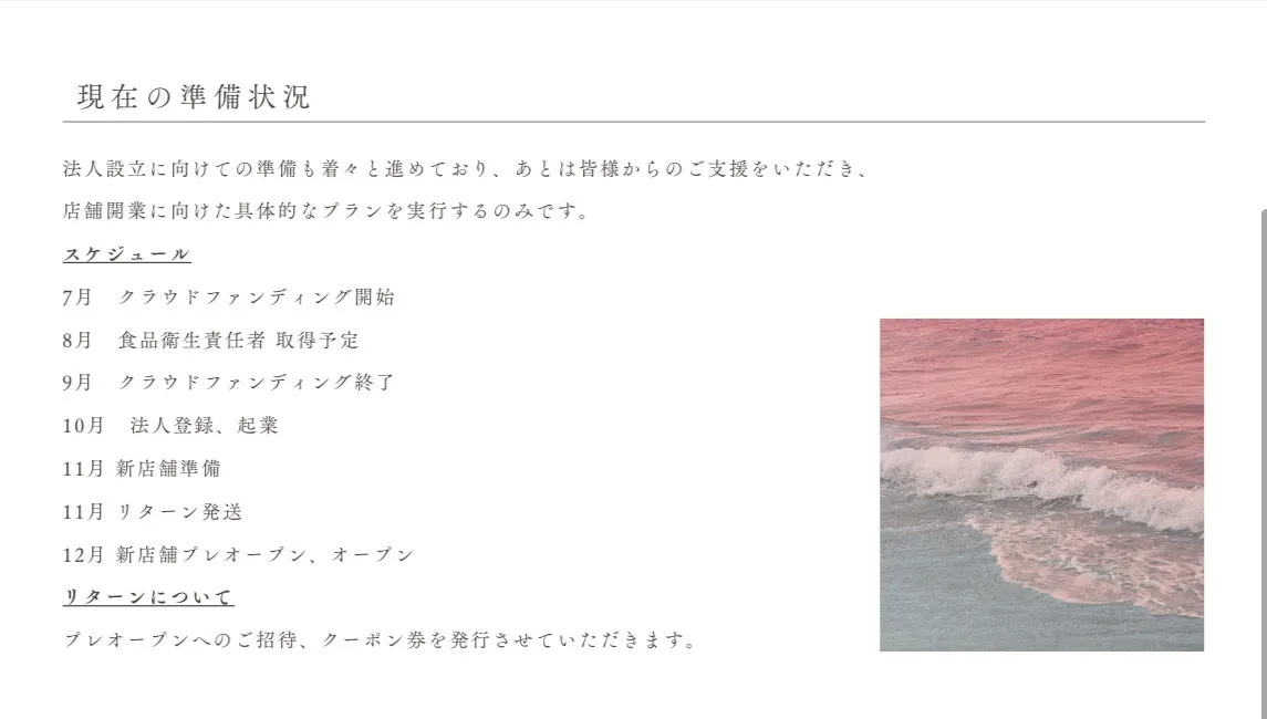 法人設立に向けての準備も着々と進めており、あとは皆様からのご支援をいただき、店舗開業に向けた具体的なプランを実行するのみです。