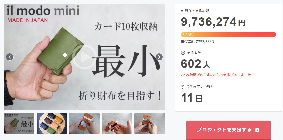 2025/02/16 21:20こんばんは!ステータシー株式会社の田中と申します。この度は「il modo mini」プロジェクトに多くのご支援ありがとうございます!お陰様で現在支援者様が600名を超えるまでになりました!支援額1000万円までもあともう少しのところまで来ております・残り11日、支援額1000万円超えを目指して引き続き頑張ります!支援者の皆様もSNSなどで当プロジェクトをシェア頂けると大変うれしい限りです!!では、引き続きどうぞよろしくお願いいたします。田中 比呂達 もっと見る