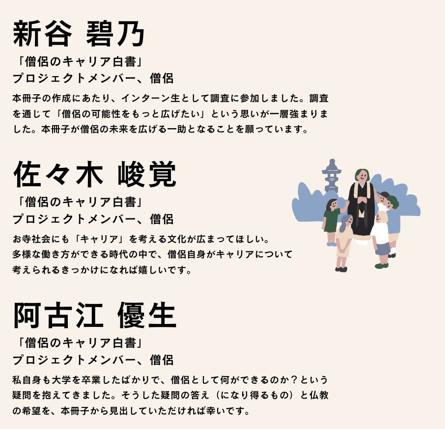 私たちはこの冊子を起点に、僧侶の働き方を支援する機会づくりに取り組みます。調査研究は今後も継続し、僧侶がよりよく働ける環境づくりに役立てていきたいと考えています。