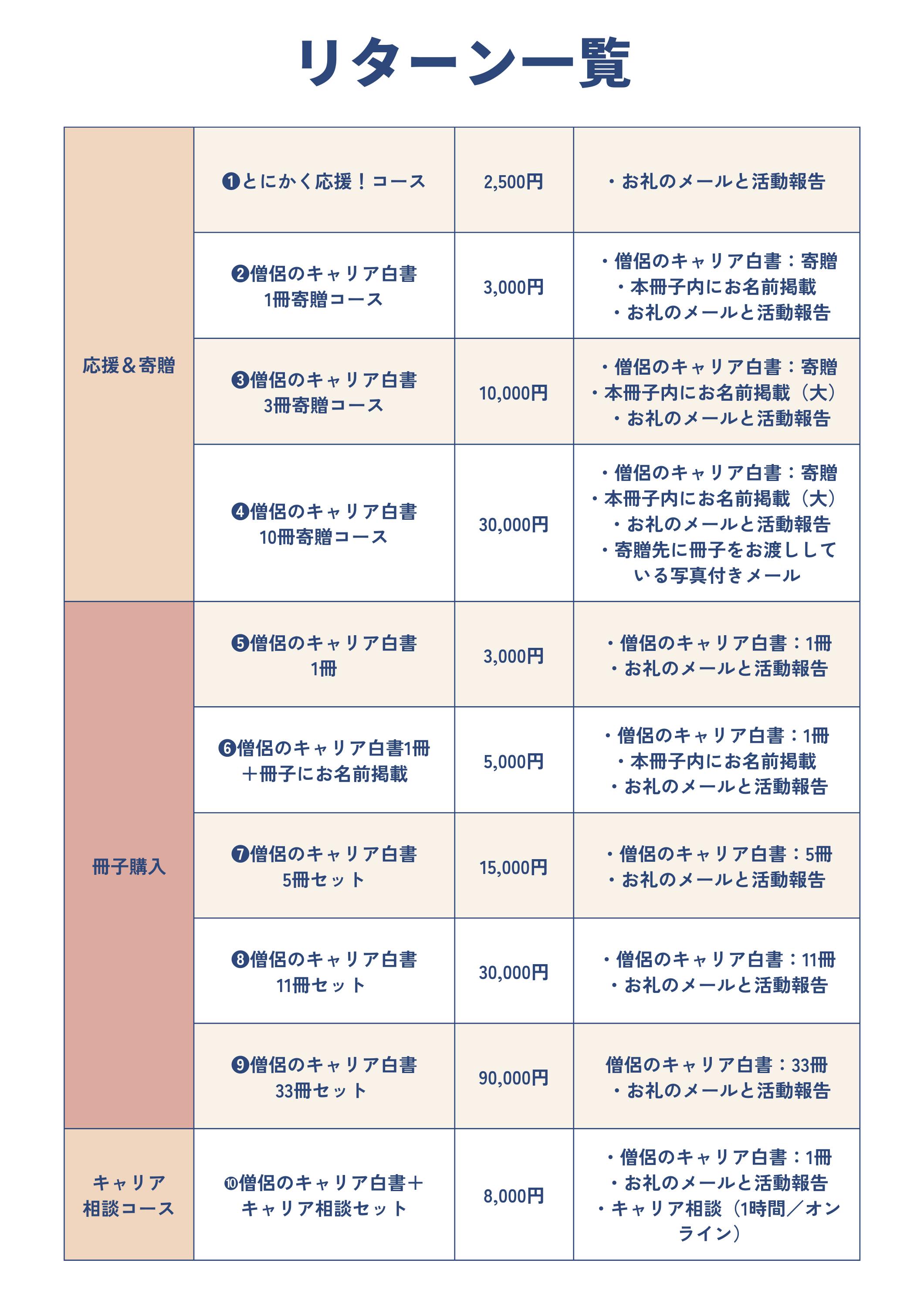 に分かれています。自分用に購入するのはもちろん、所属している団体などで配りたいという方などに向けて、複数冊購入のリターンもあります。