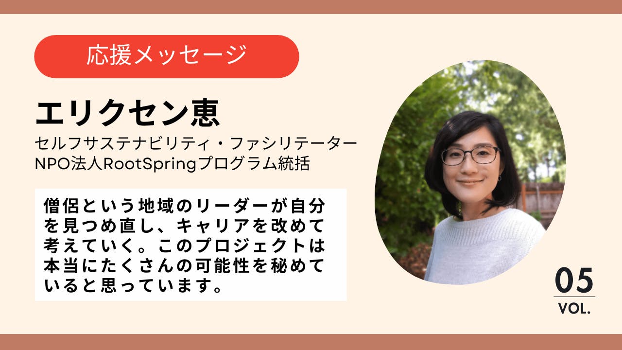 応援コメント第5弾は、私たちが以前から取り組んでいる僧侶向けのキャリアスクールでも講師を務めてくださっている、エリクセン恵さんです。