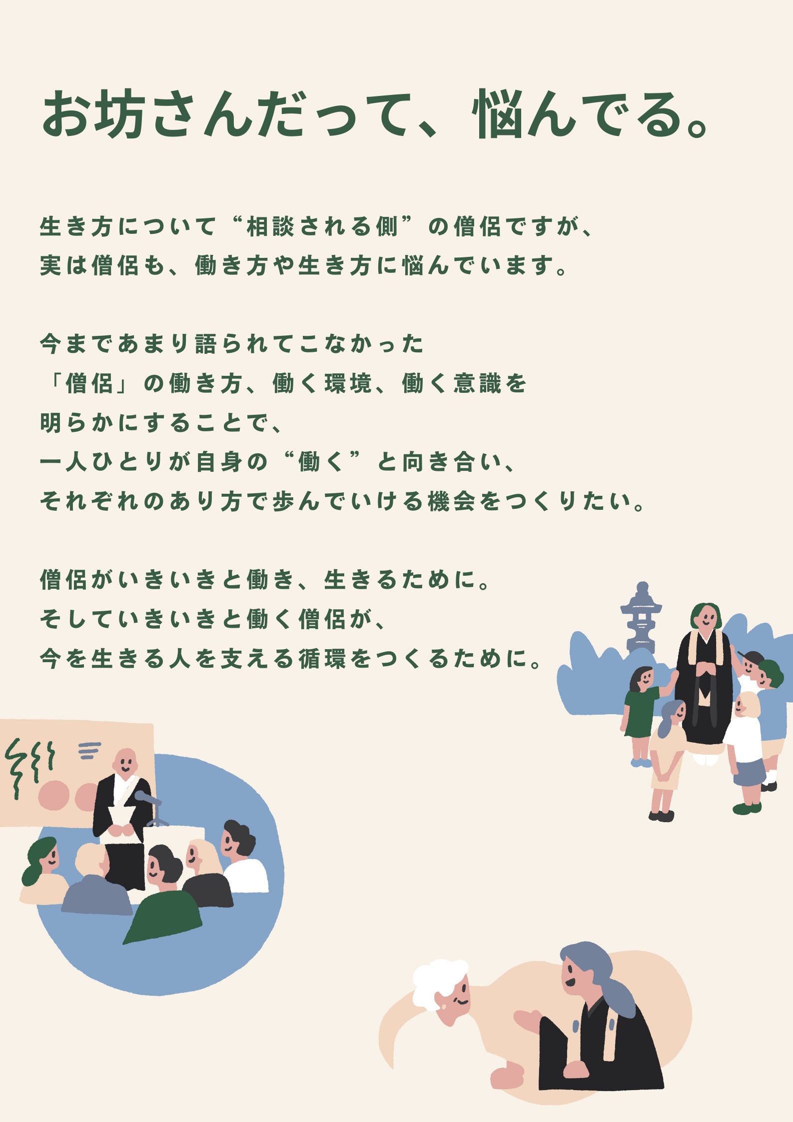 本冊子を起点に、「僧侶の働き方」についての議論が、広くなされるようになって欲しいですし、一緒に向き合い、考えてくれる仲間を必要としています。