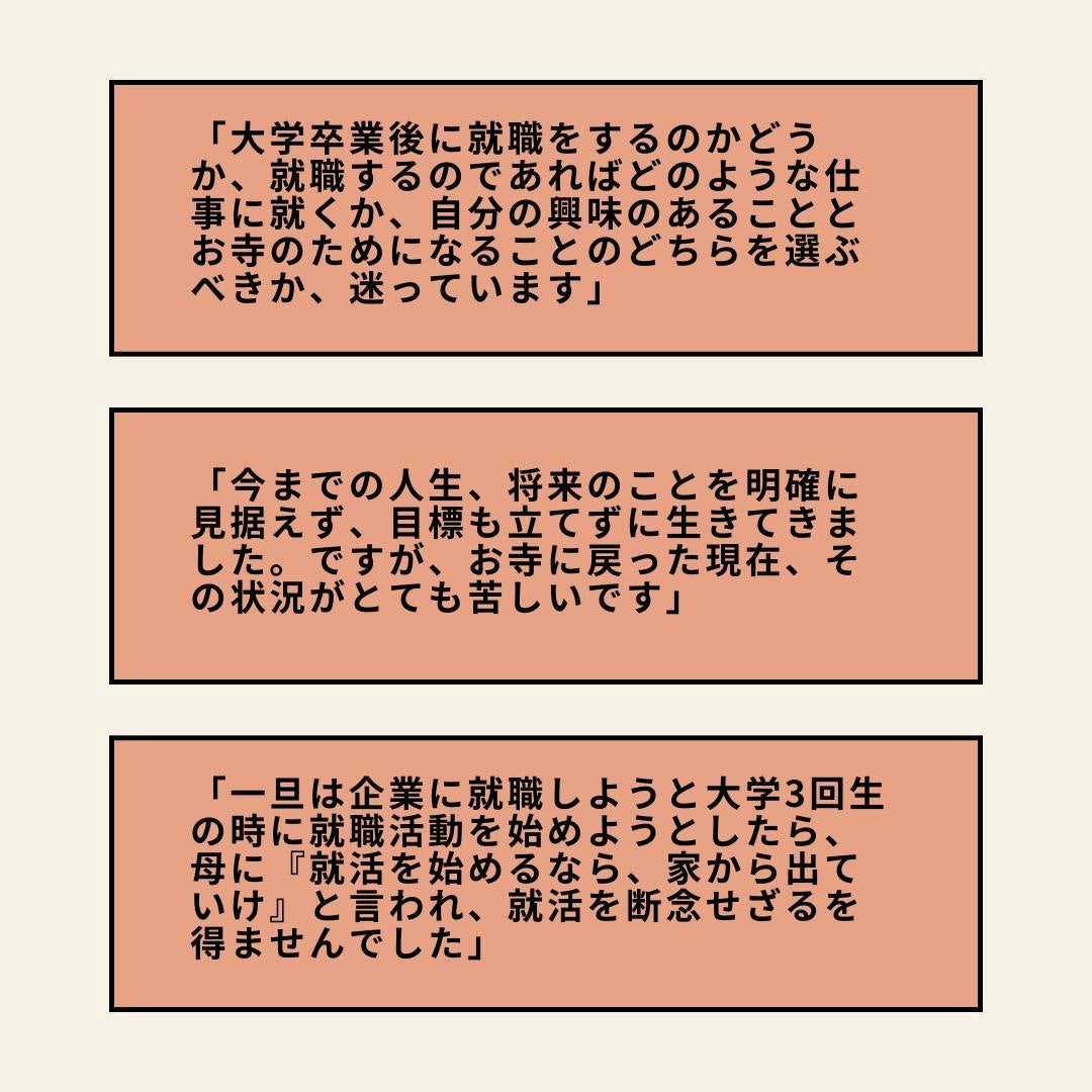 そうした思いから、僧侶が「どう生きたいのか、働きたいのか」と向き合うキャリアスクールを運営してきました。その中で、想像以上に「キャリア(働き方・生き方)」に悩む僧侶がいることを知ります。