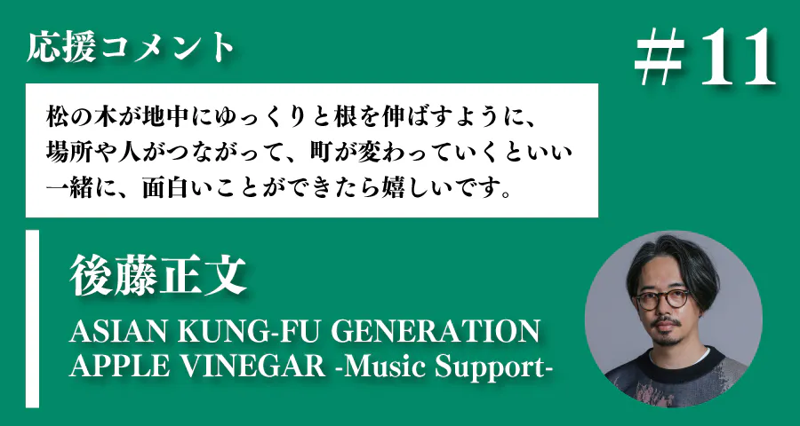 2024/10/31 12:59後藤正文1976年静岡県生まれ。ASIAN KUNG-FU GENERATIONのボーカル&ギターであり、ほとんどの楽曲の作詞・作曲を手がける。2010年、自身主宰のレーベル「only in dreams」を発足。また、エッセイや小説の執筆といった文筆業や、新しい時代やこれからの社会など私たちの未来を考える新聞『THE FUTURE TIMES』の編集長を務める。2018年からは新進気鋭のミュージシャンが発表したアルバムに贈られる作品賞『APPLEVINEGAR -Music Award-』の立ち上げなど、音楽はもちろん社会とコミットした言動でも注目されている。2024年5月、静岡県藤枝市にて『NPO法人 アップルビネガー音楽支援機構』を設立。インディペンデントに活動するミュージシャン・アーティストへの支援、さらに藤枝市内に滞在型音楽制作スタジオ「Music Inn Fujieda」を建設予定。これまでに”Gotch”名義で3枚のアルバムをリリース。2024年3月 ”後藤正文” 名義で初の音楽作品となるドローン/アンビエント・アルバム『Recent Report I』を配信リリース。著書に『何度でもオールライトと歌え』『YOROZU~妄想の民俗史~』『凍った脳みそ』『INU COMMUNICATION』『後藤正文の朝からロック』など。gotch.infosiankung-fu.comapplevinegarmusicsupport.com 昔の東海道は鉄道や新幹線に置き換わって、いつのまにか街道としての雰囲気が薄れてしまいました。そういうことに、僕も静岡県民のひとりとして、興味を持たずに暮らしてきました。この歳になって、自分の生まれた地域を歩いてみて、それがとても寂しいと思うのと同時に(例えば、松の並木はほとんどなくなってしまった…)、今だったらまだ間に合うのかもしれないと思いました。大慶寺を中心に、藤枝の旧市街地が新しい藤枝宿へと変わっていく未来を想像すると、明るい気持ちになります。そんなに簡単なことではないでしょうけれど、松の木が地中にゆっくりと根を伸ばすように、場所や人がつながって、町が変わっていくといいですね。僕も藤枝宿の端っこで、ミュージシャン支援のための滞在型スタジオを仲間たちと作ることにしました。きっと昔の藤枝宿にも、旅芸人が多く滞在していたんだと思います。そんな風景を現代に新しい形で復活させられたら、由緒につながる町づくりになりますよね。一緒に、面白いことができたら嬉しいです。宿坊の完成、楽しみにしています! もっと見る