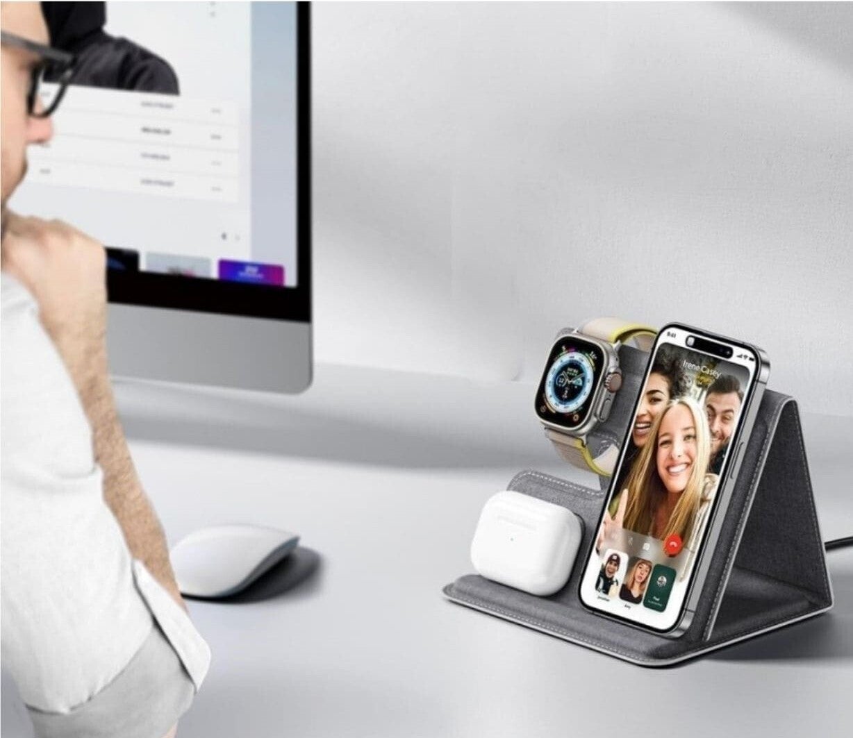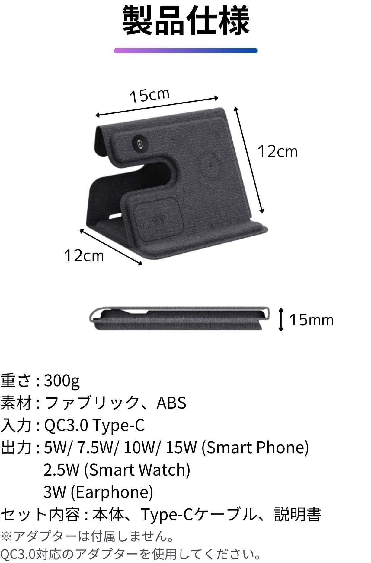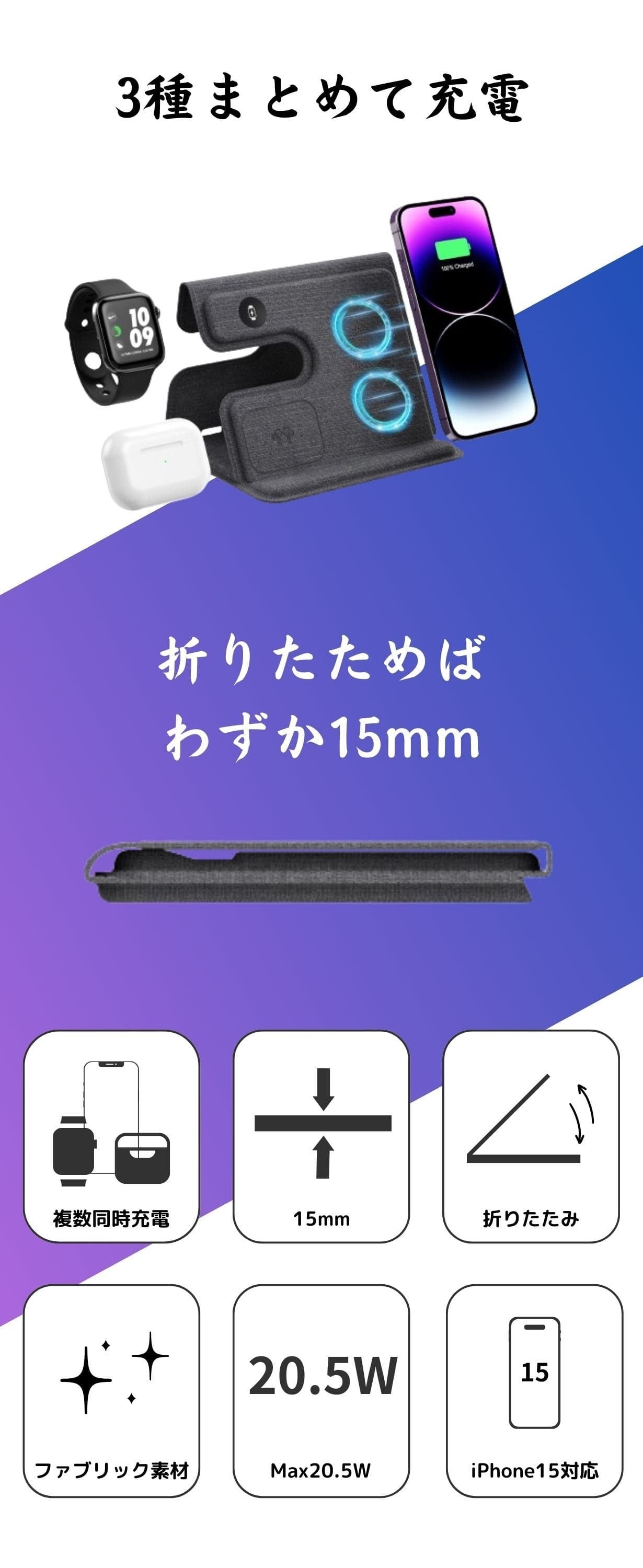 3in1 Wireless Chargerは折りたためるので、持ち運びにとても便利で、持ち物を少なくしたい方にピッタリです。