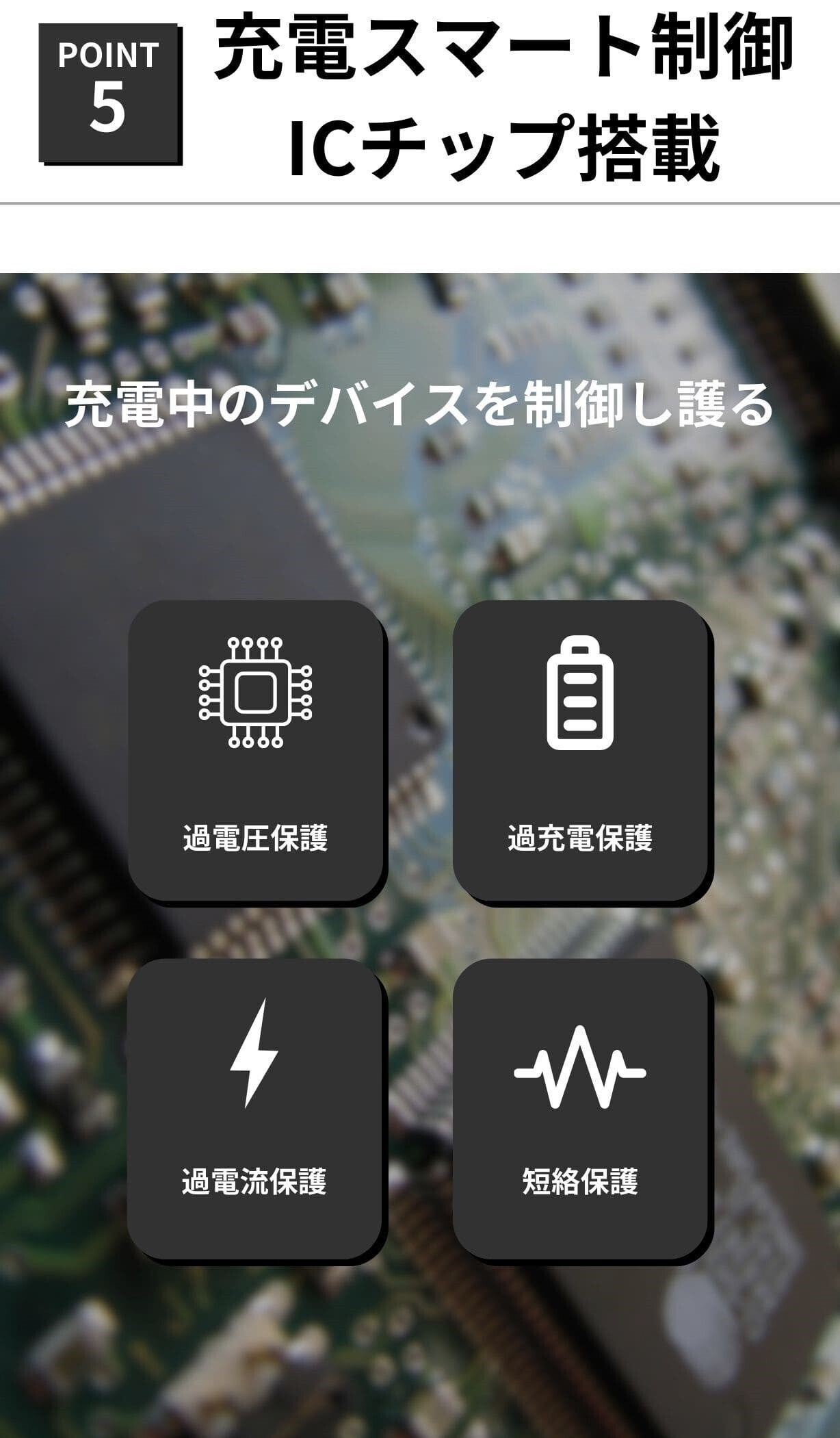 過充電保護、過電流保護、過電圧保護、短絡保護などの保護機能を搭載。
