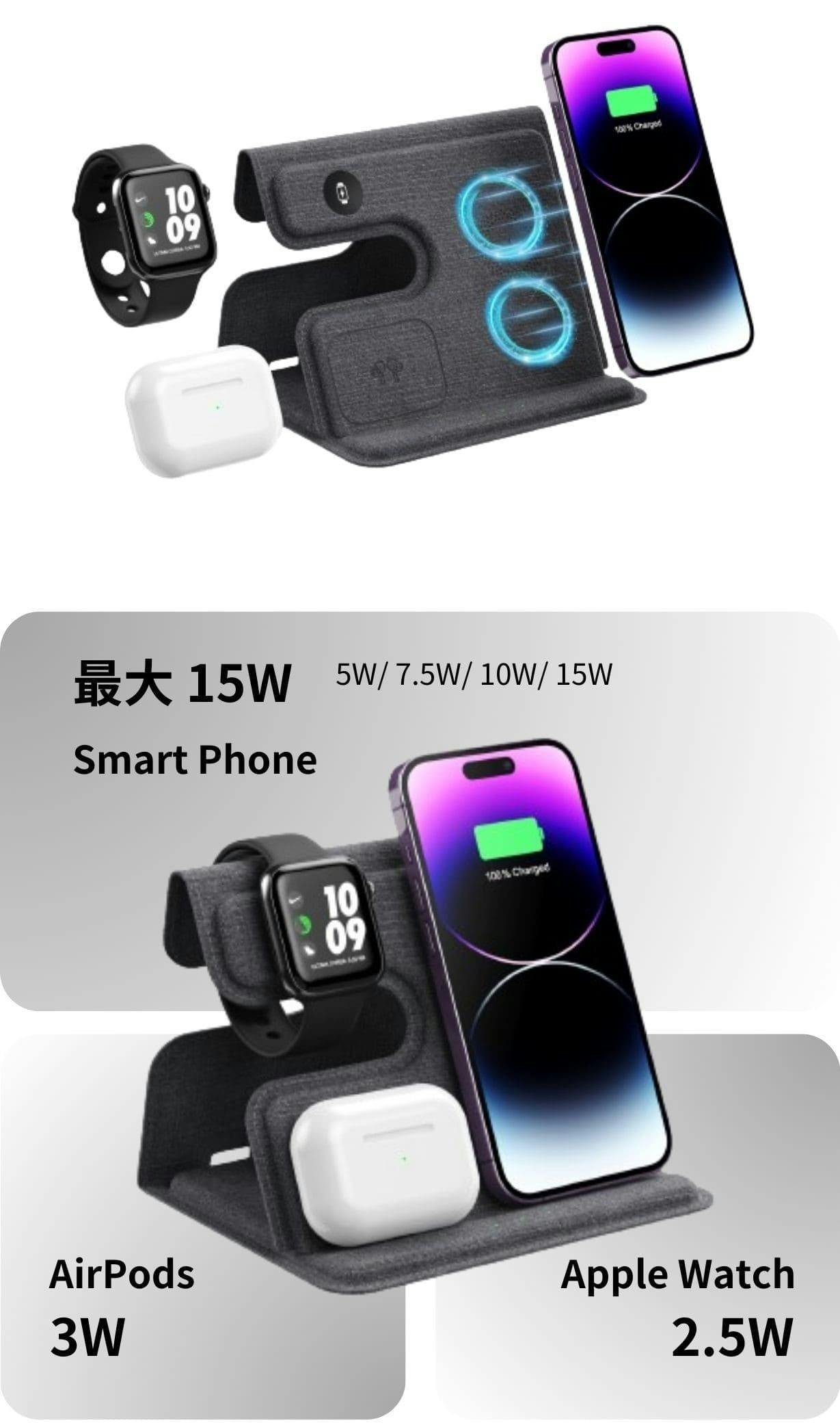 3in1 Wireless Chargerは折りたためるので、持ち運びにとても便利で、持ち物を少なくしたい方にピッタリです。