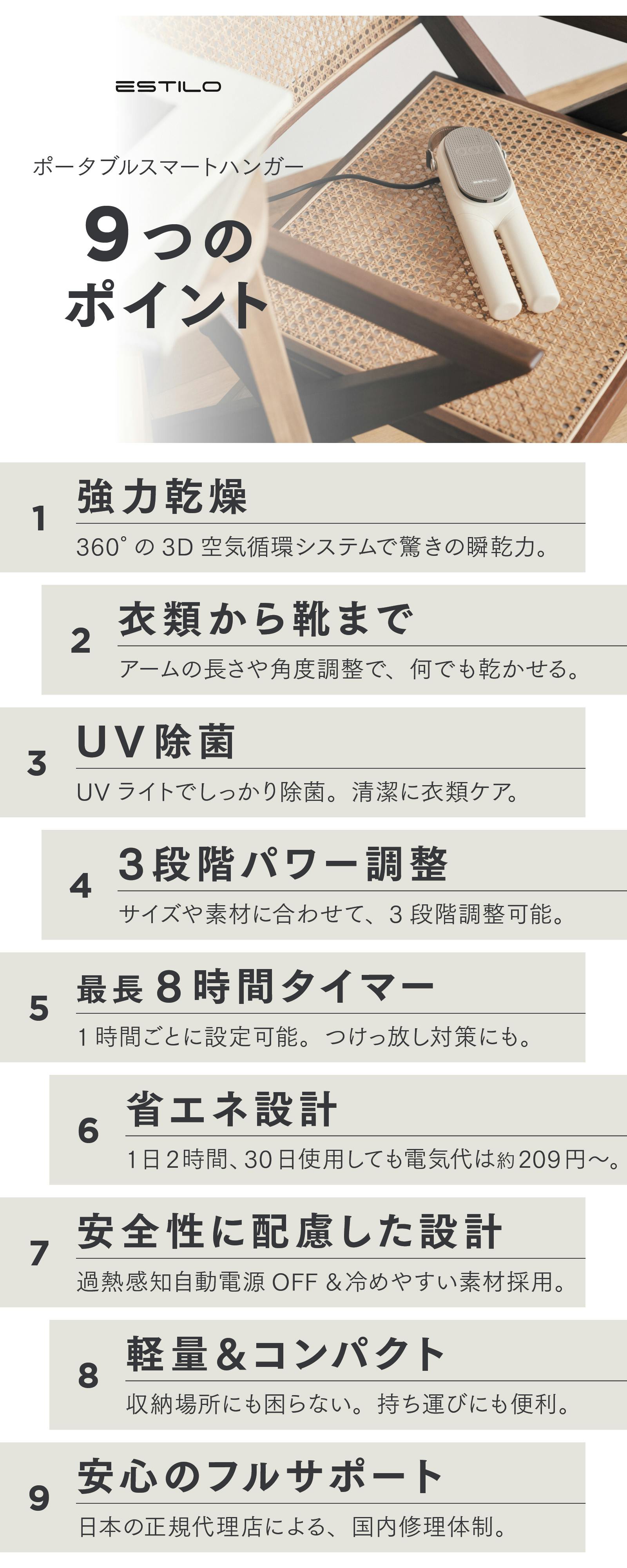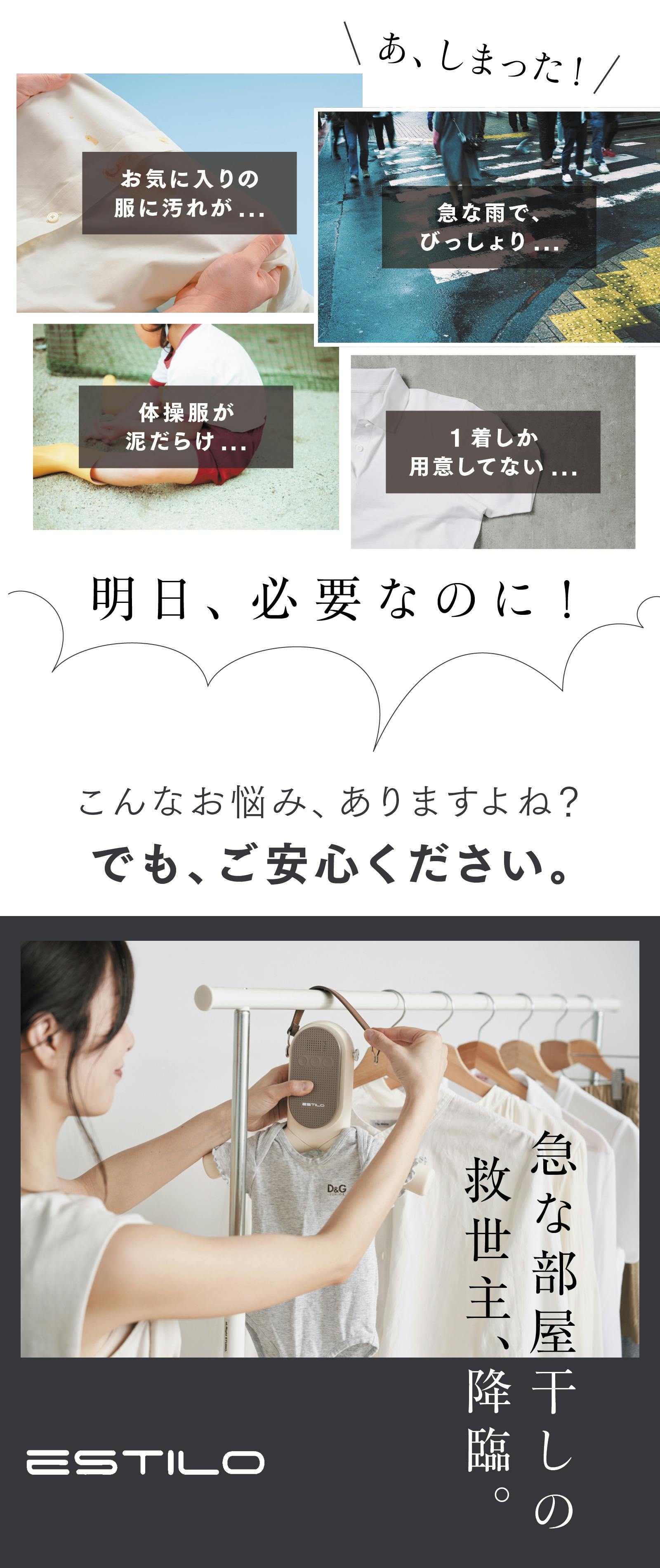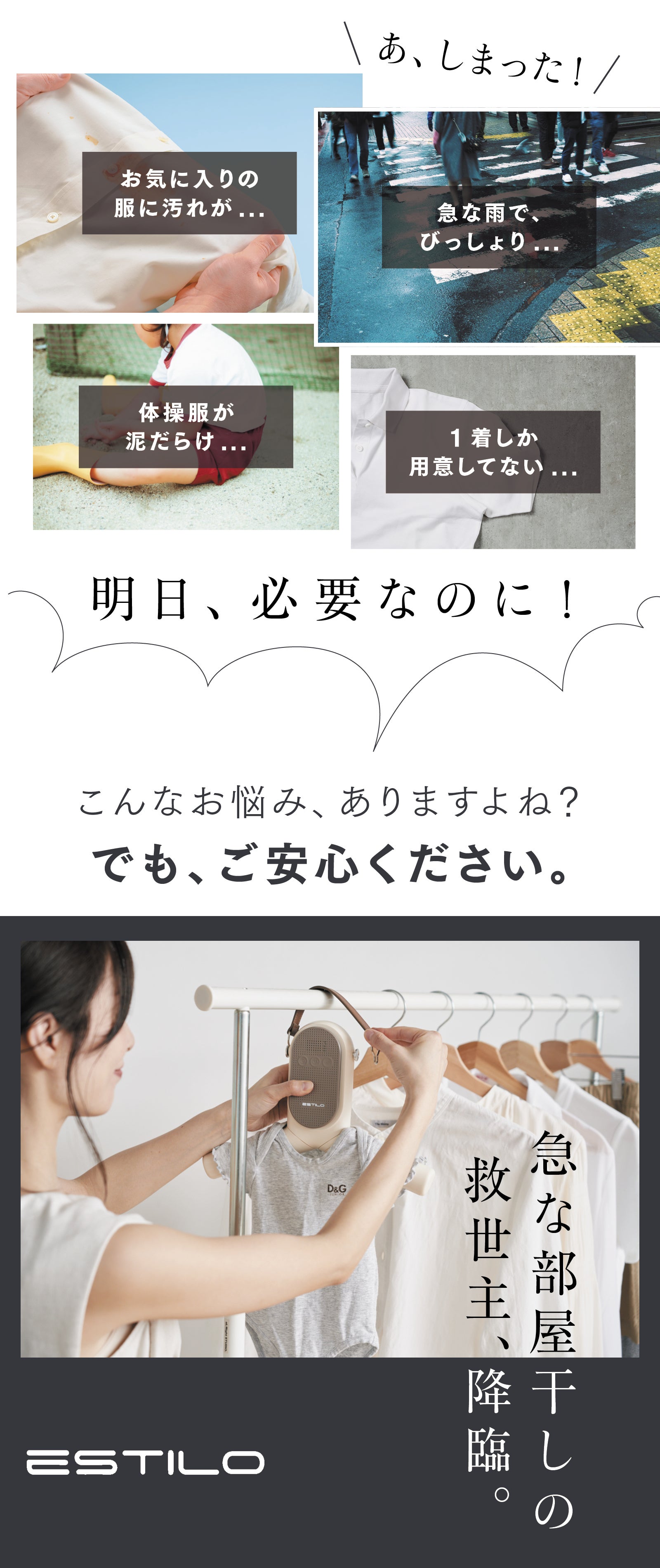 エスティロは、2022年12月に日本初上陸して以来、多くのお客様からの支持をいただき、生活家事をより便利にする製品開発に力を注いでいます。今回ご紹介する「エスティロ スマートハンガー」は、衣類乾燥に悩む方や、乾燥機などの大型家電を置くスペースがない方々の声から生まれました。手軽に乾燥ができ、収納可能なこの製品は、コンパクトなサイズとわずか約510gの軽さで、衣類乾燥、除菌、靴の乾燥までこなします。エスティロ スマートハンガーは、皆様の生活をより便利にすることでしょう。エスティロはこれからも、皆様の生活に便利と時短をもたらす製品開発に全力を尽くします。今回のプロジェクトも応援のほど、どうぞよろしくお願い致します。