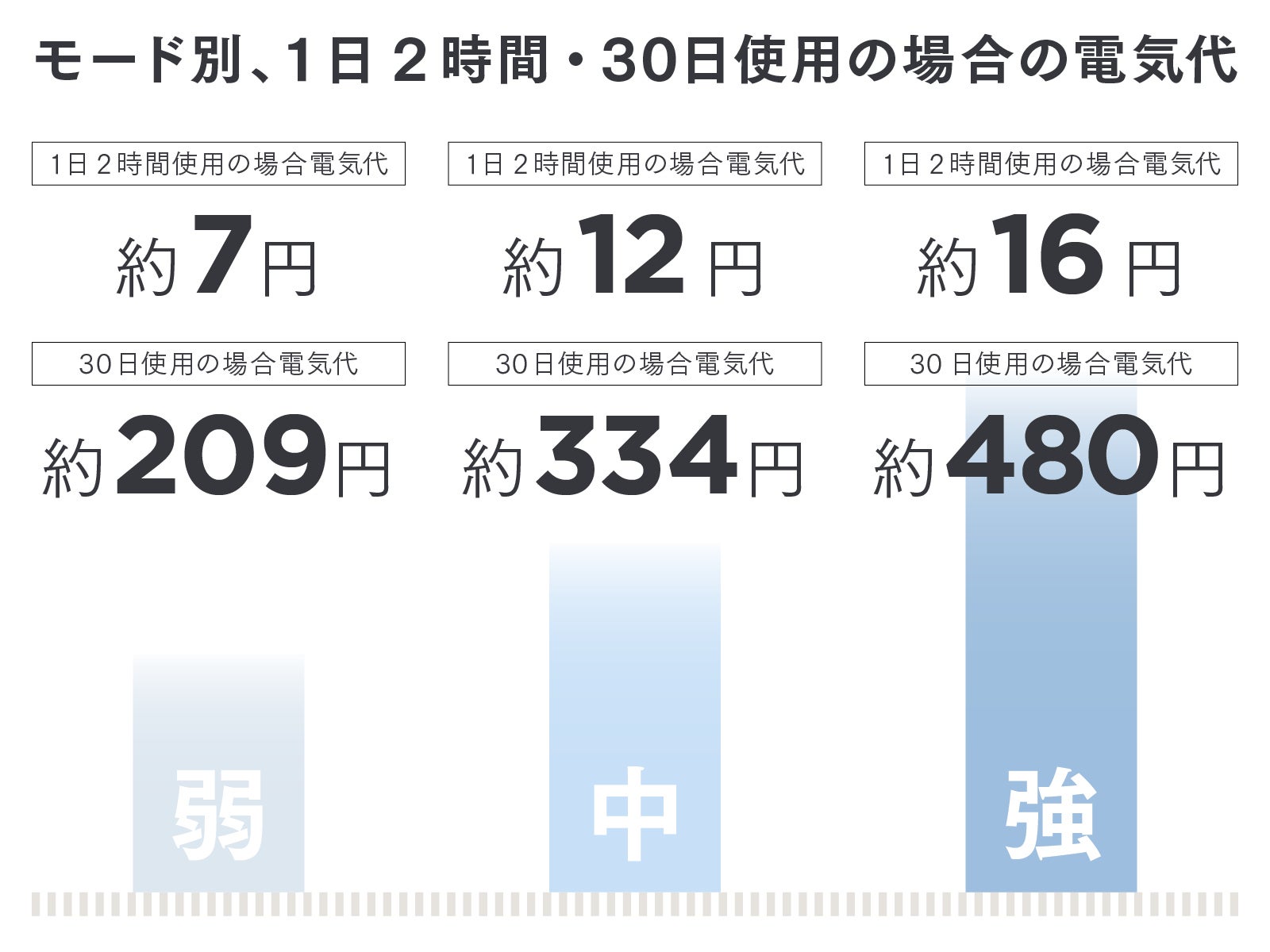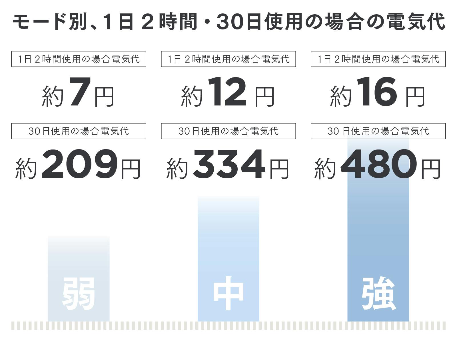 「強モード」でも、1日2時間使用した時の電気代は約480円。
