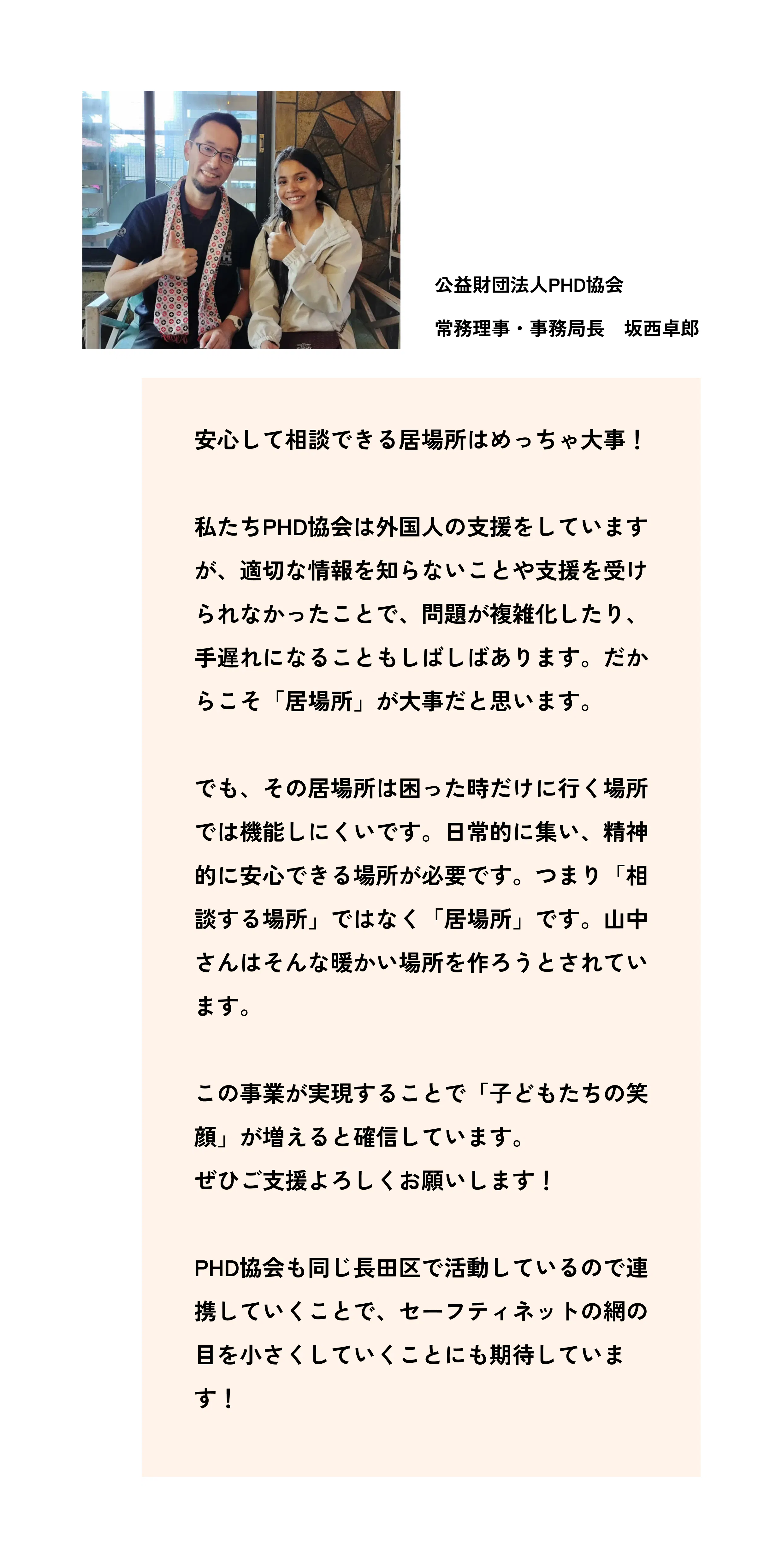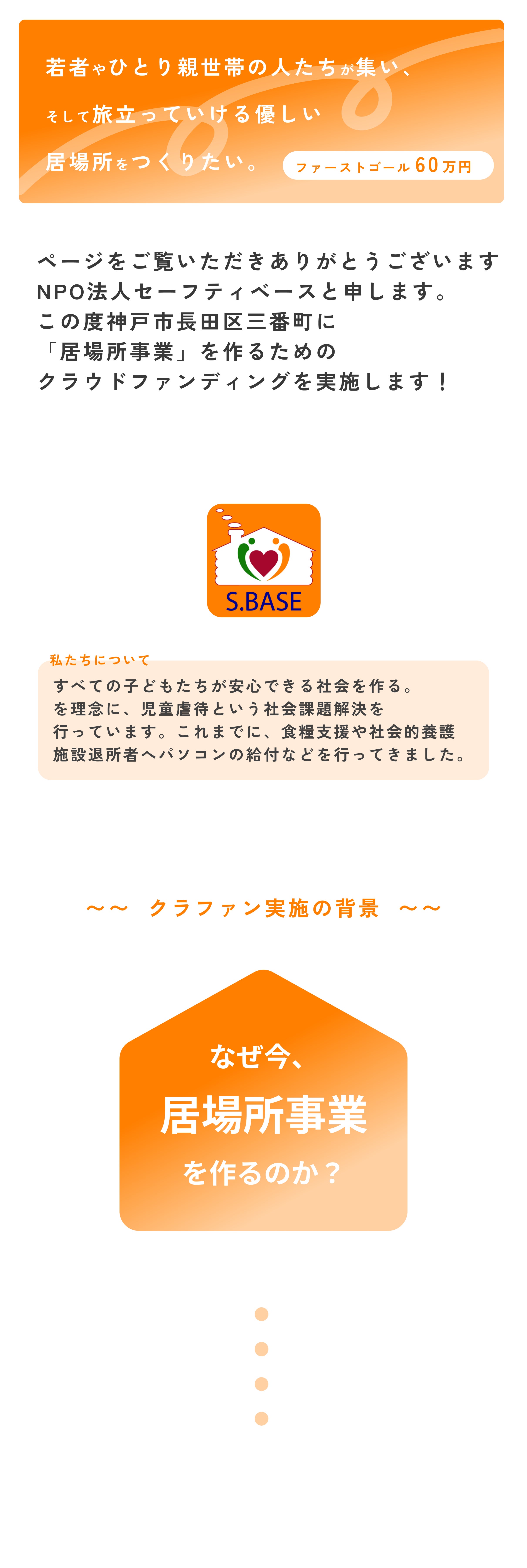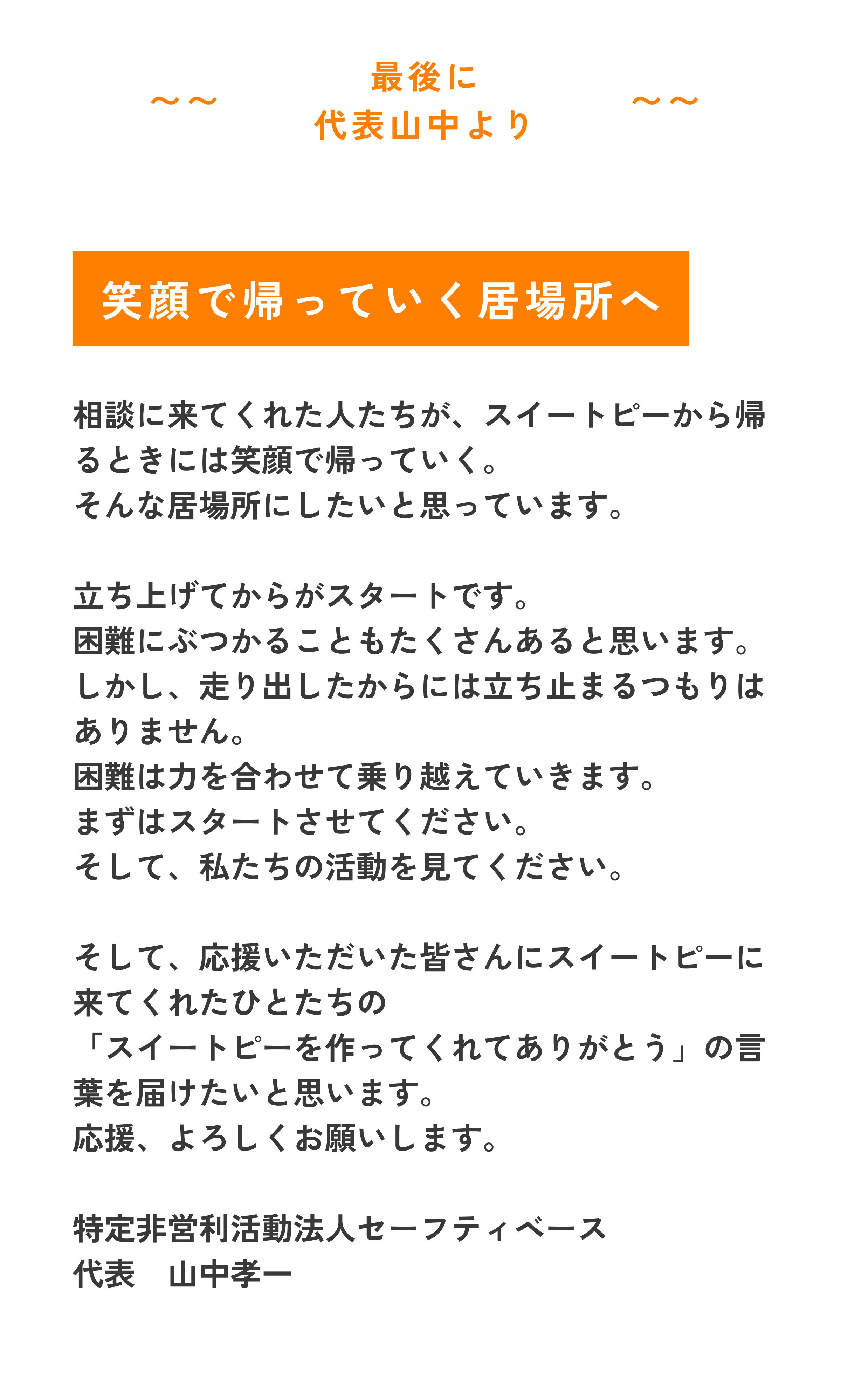 2024/12/17 10:46皆さん、ご無沙汰しております。11月26日に「神戸若者・子育てサポートセンタースイートピー」がオープンしてから、想像以上にバタバタとしていてなかなか活動報告をすることができませんでした。ようやっと、少しだけ時間が作れたので11月に私達の団体が行った活動について報告書を作成しましたのでこちらで共有したいと思います。良かった見ていただけるとありがたいです。報告書の最後でスイートピーで必要な物を記載しています。もし、皆さんで該当品で使ってないからスイートピーで使ってという物がありましたら、譲っていただけますでしょうか。ちなみに・自転車、二人掛けソファー、レンジ台、炊飯器、傘立て、コーヒーメーカー、本棚、IHクッキングヒーター、冷凍庫(冷凍専用)以上です。よろしくお願いします。活動報告は以下のリンクを開いてご覧になってください。2024年11月度セーフティベース活動報告書12月14日、15日に児童養護施設や自立援助ホームにクリスマスプレゼントの配布を行いました。詳しいご報告をまたさせていただきます。楽しみしていてください。これからもNPO法人セーフティベースの応援、ご支援よろしくお願いします。 もっと見る